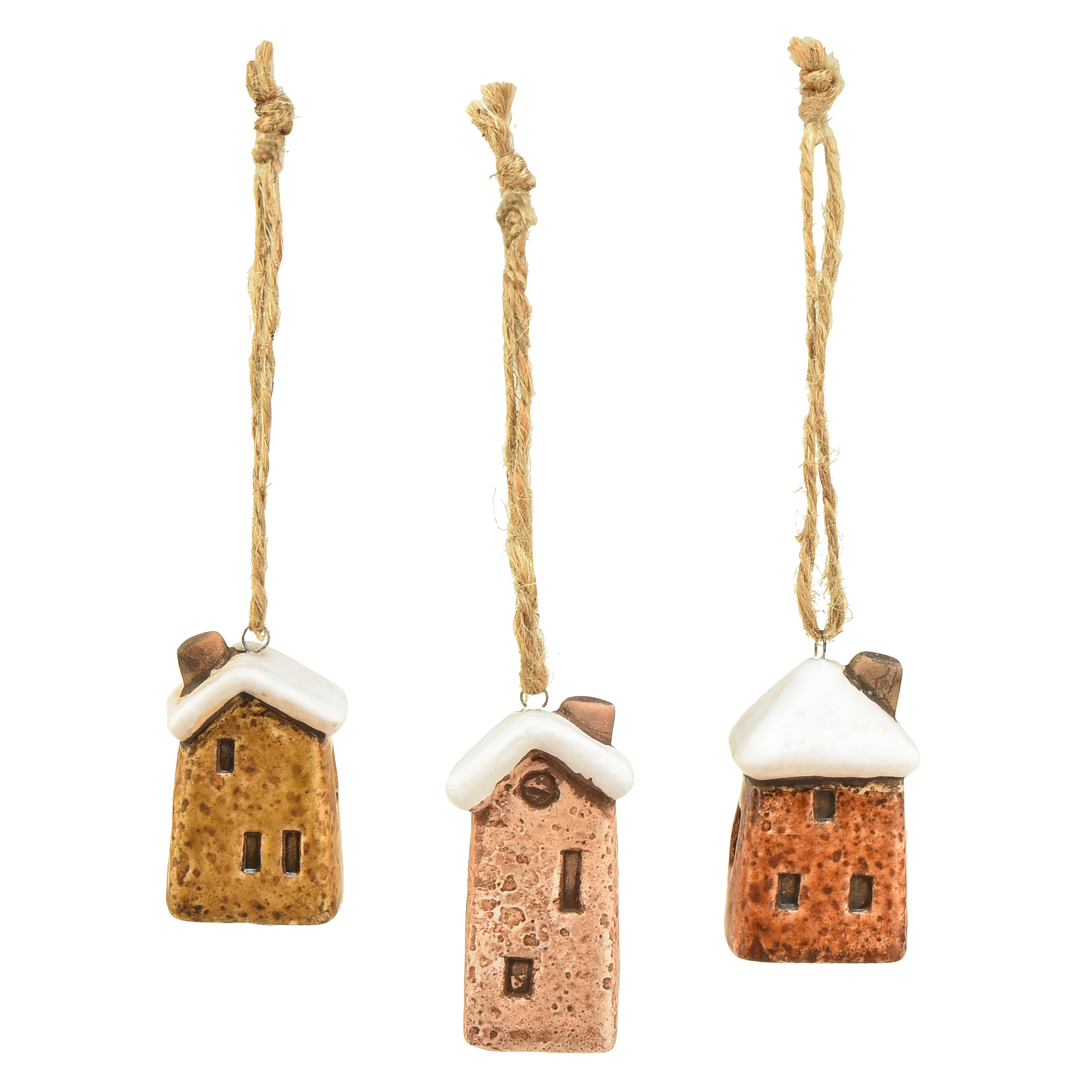 Keramické závěsné domky – různé odstíny hnědé, sněhové střechy – okouzlující vánoční dekorace – balení 6 ks