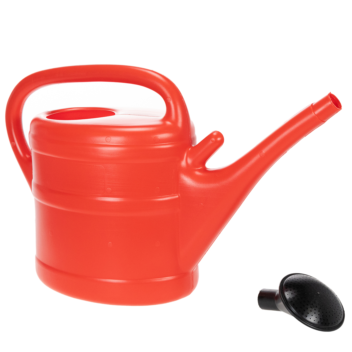 Červená konev je vyrobena z odolného plastu a je dodávána s odnímatelnou hubicí.