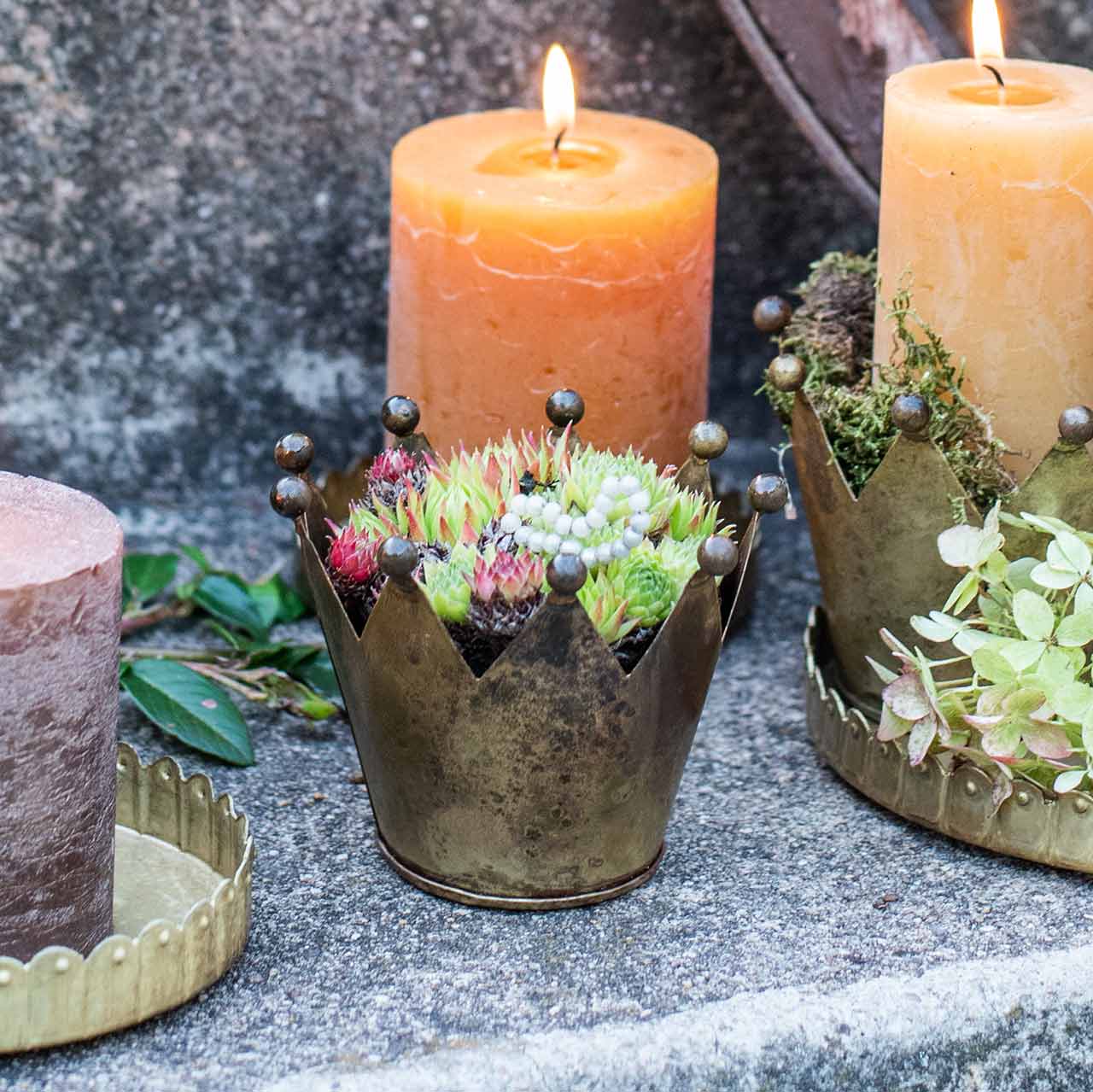 Malá kovová dekorace se proto skvěle hodí do vánoční dekorace nebo také do vašich mosazných svícnů. Do korunky ve zlaté barvě vložte čajovou svíčku nebo ozdobnou korunku použijte jako malý květináč, například na sukulenty. Kouzelně vypadá v mosazné korunce také LED čajová svíčka nebo mini aranžmá. Pro malou předvánoční dekoraci, s fólií jako květináč nebo jako adventní dekorace s větší kovovou korunkou ve stejném stylu, vždy korunka najde uplatnění.