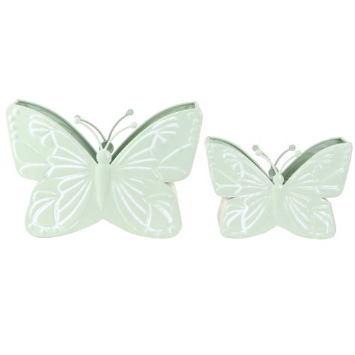 Dodejte vaší jarní a letní výzdobě nádech vintage kouzla s okouzlujícím motýlkovým kovovým květináčem v mátově zelené barvě. Tyto umně navržené kovové květináče kombinují funkčnost s hravým designem, který ponoří váš interiér nebo balkon do jarní květinové nádhery. Každá sada obsahuje dva různě velké květináče v jemné mátově zelené s elegantním, bíle praným vintage povrchem. Květináče jsou navrženy ve tvaru motýla, a proto poskytují jedinečný poutač. Náročně zpracovaná křídla a filigránový design podtrhují styl shabby chic, který je ideální pro nostalgické koncepty interiérového designu. Ať už na terase, na balkóně nebo ve vašem obývacím pokoji, tato sada motýlích dekorací obohatí vaše okolí o kus umění a přírody. Objevte ve Floristik24 odpovídající dekorativní prvky, jako jsou jemné sušené květiny nebo jiné kovové dekorace v mátově zelené barvě, které doplní celkový obraz.