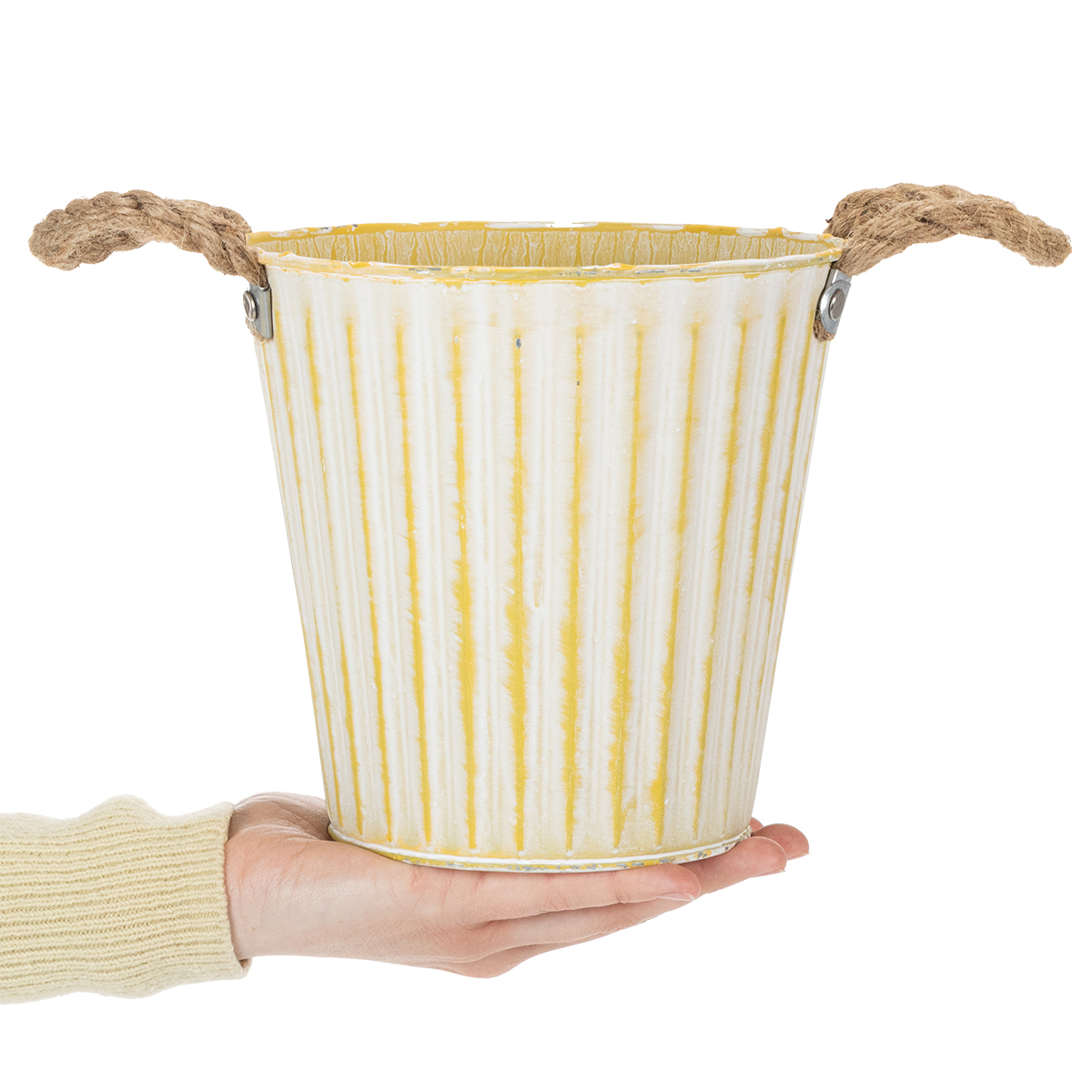 Tento kovový květináč je ideální pro jarní dekorace: květináč v pastelově žluté barvě s rukojetí z jutové šňůry je vymytý v bílé barvě v trendy shabby chic.