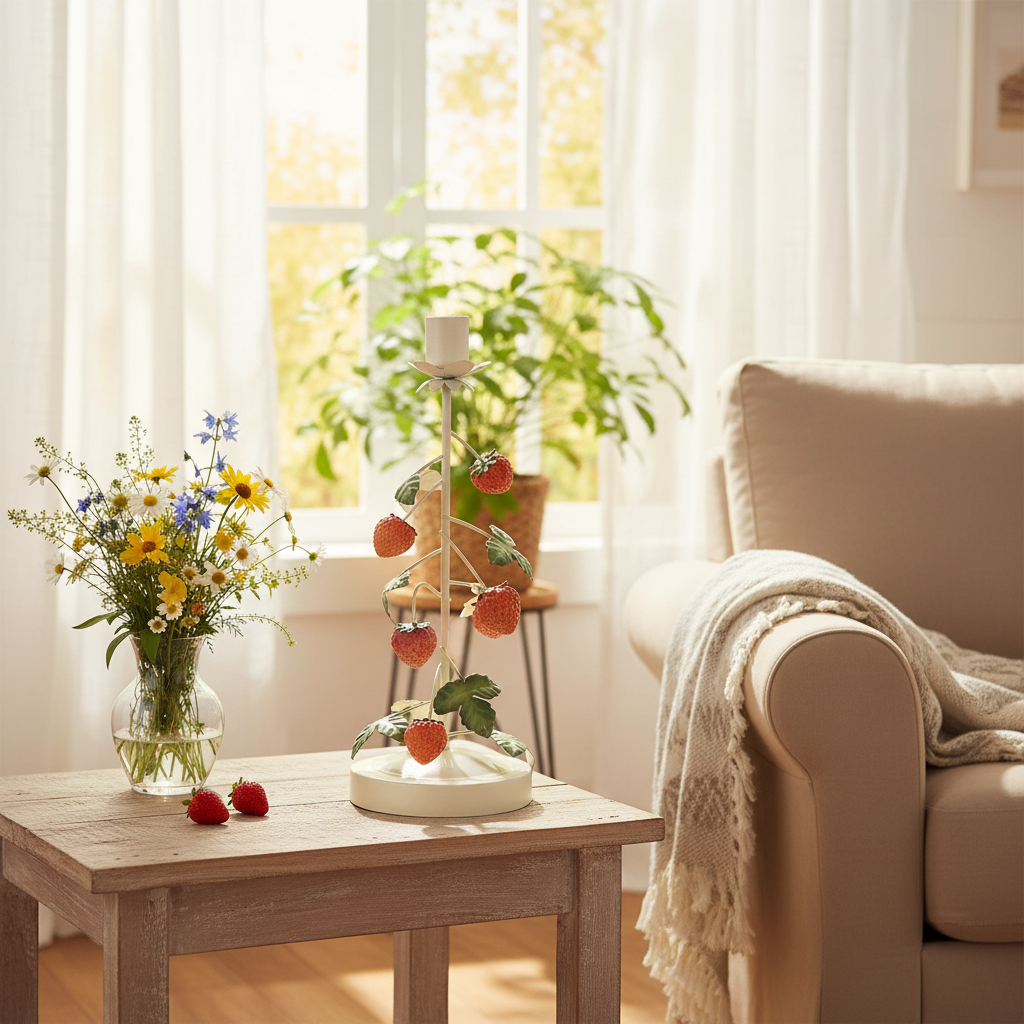 Exkluzivní kovový svícen s jahodovým zdobením – ideální pro vaši letní dekoraci