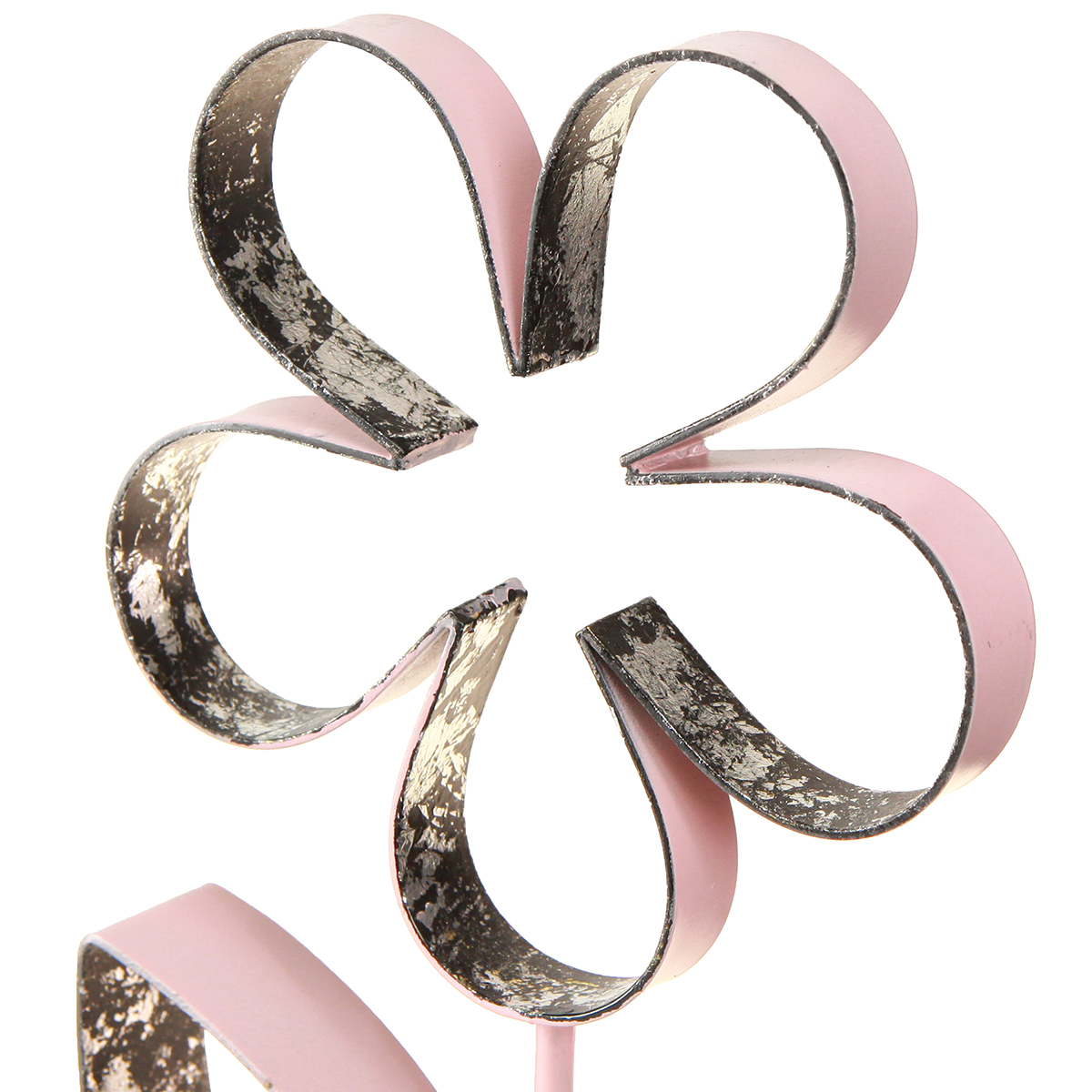 Kovová květina v růžové a stříbrné barvě na přírodním dřevěném podkladu - vintage dekorativní stojan na jaro