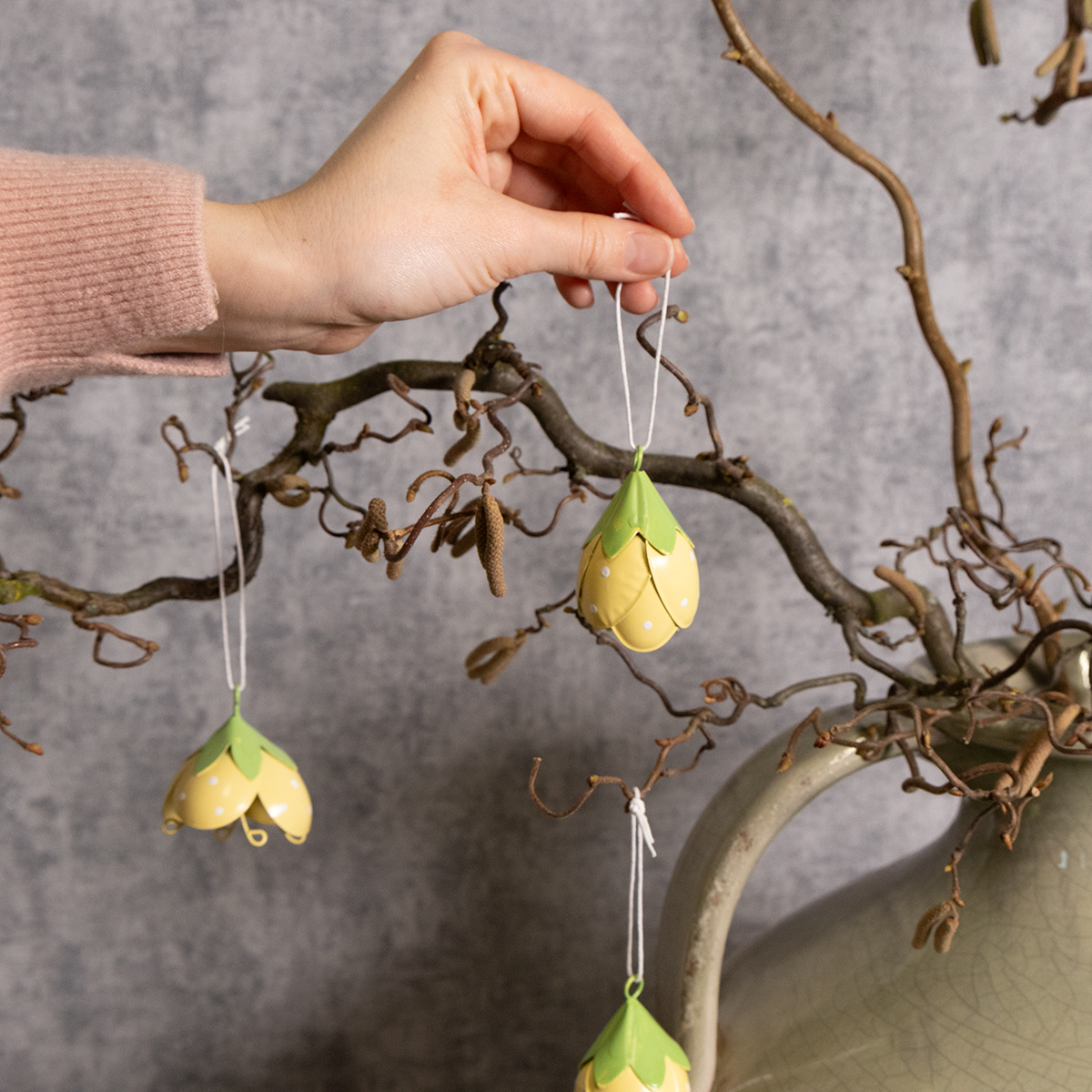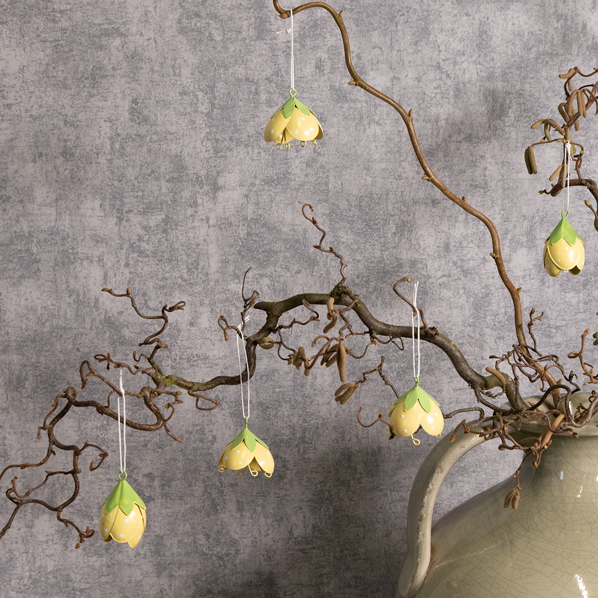 Tyto závěsné kovové květiny jsou ideální pro každého, kdo miluje hravé a romantické dekorace. S výškou 6 cm a průměrem 4 cm nejsou příliš velké, přesto jsou stylovým poutavým prvkem. Jemné žluté a zelené barvy vytvářejí svěží vzhled a krásně se začlení do různých stylů – od venkovského stylu a shabby chic až po klasické květinové aranžmá. Díky vysoce kvalitní kovové konstrukci jsou květiny robustní a vhodné pro použití v interiéru i exteriéru. Obzvláště okouzlující vypadají ve vstupní hale, kde vítají hosty veselým nádechem.