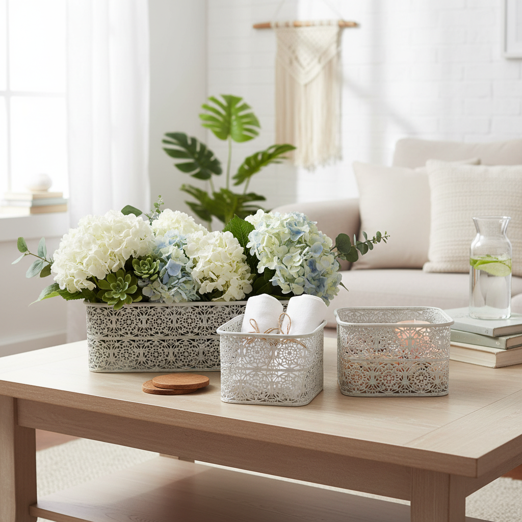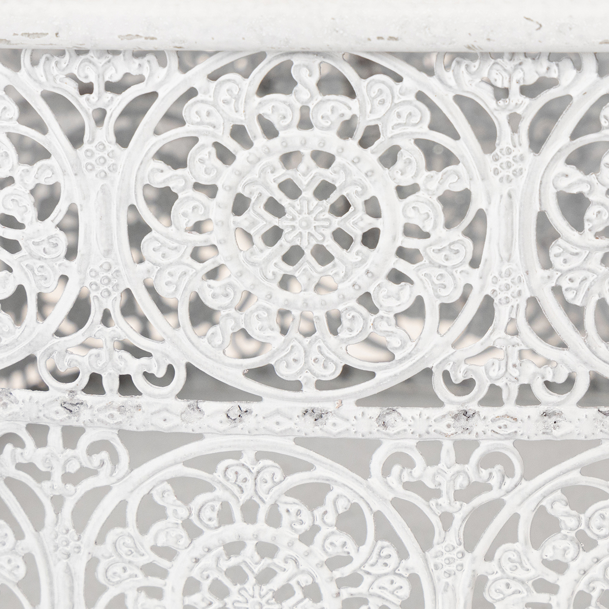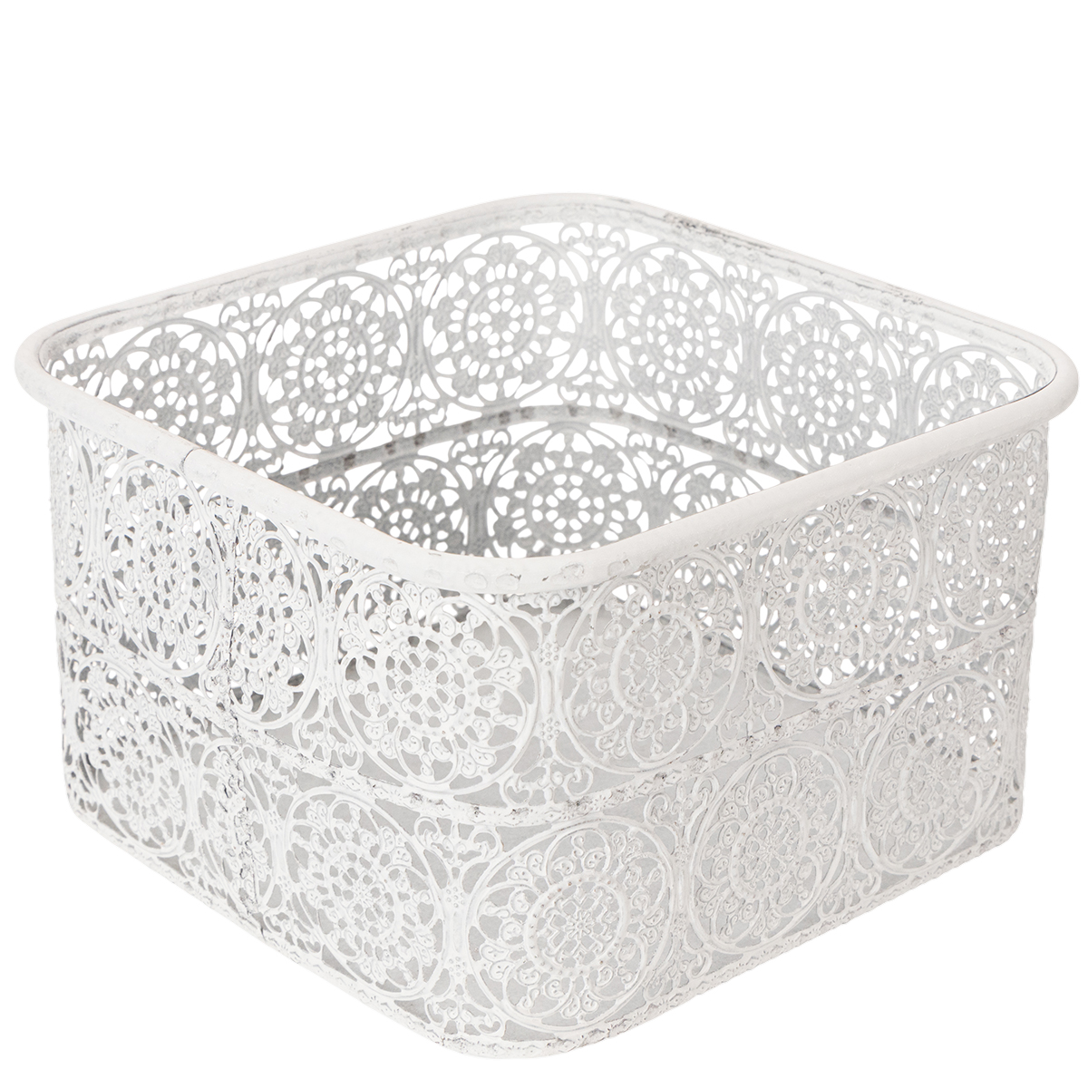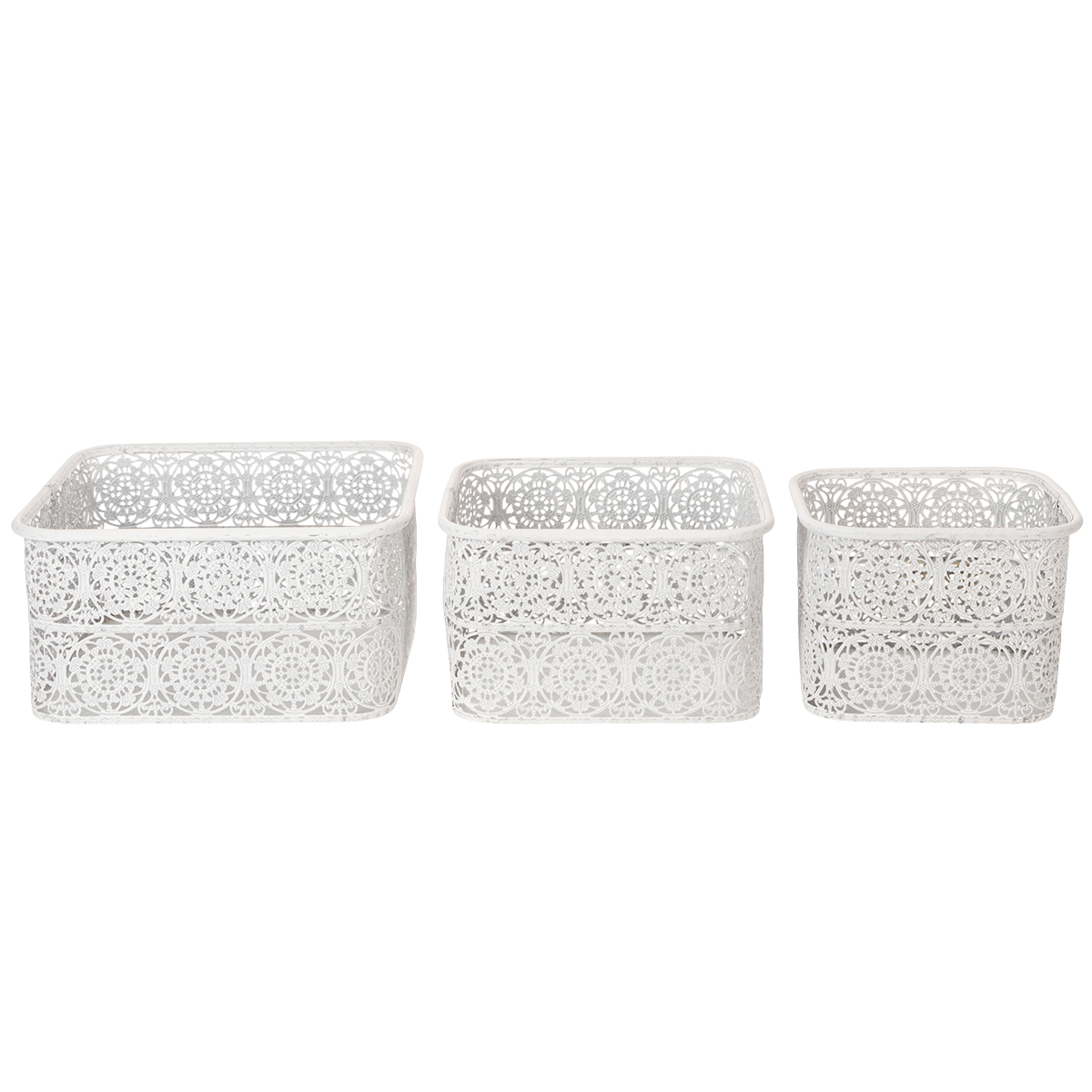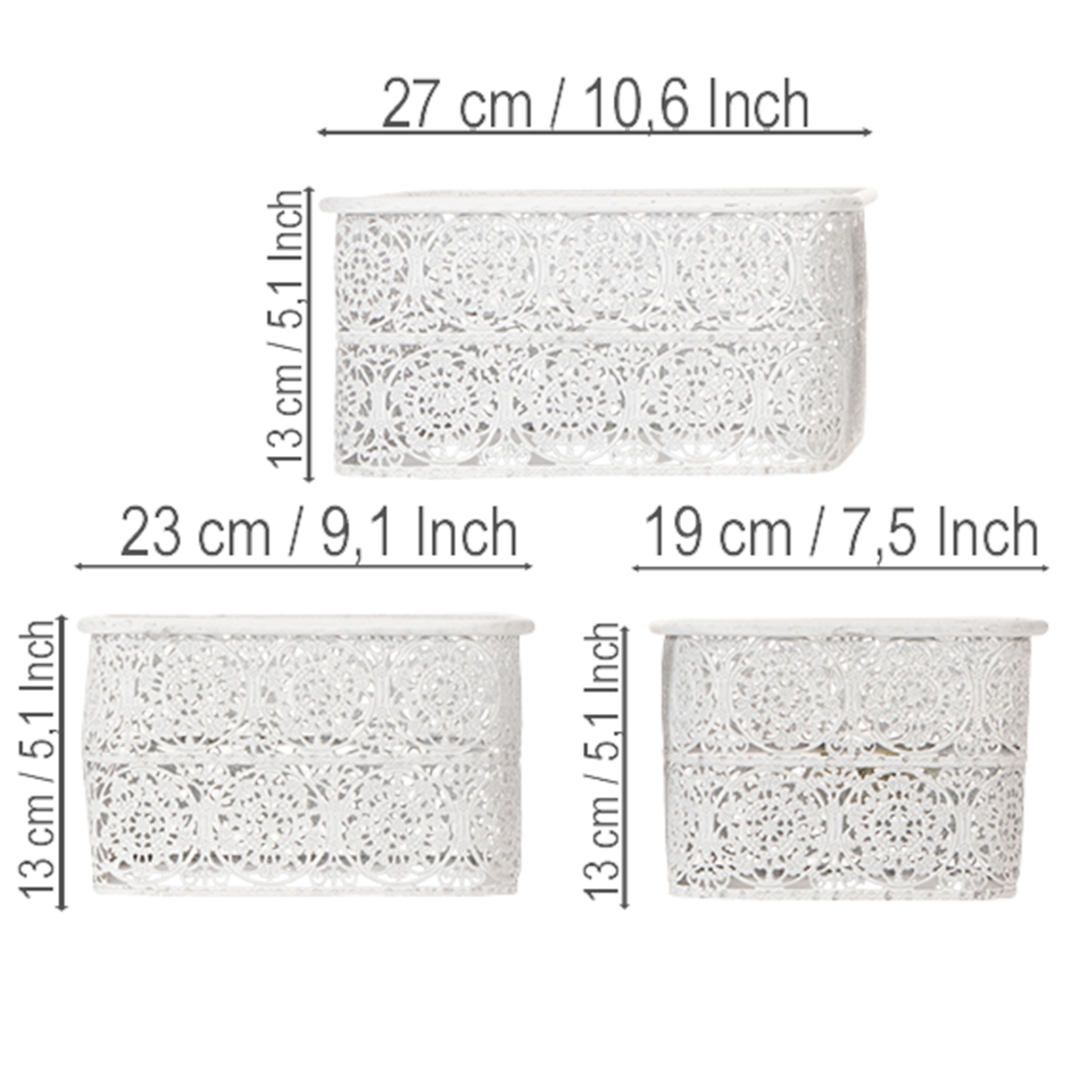 Tyto kovové misky s krajkovým vzorem jsou dodávány v praktické sadě 3 kusů v různých velikostech. Hranaté ozdobné nádoby jsou navrženy v trendy shabby chic, takže stříbro kovu místy prosvítá skrz bílou barvu.