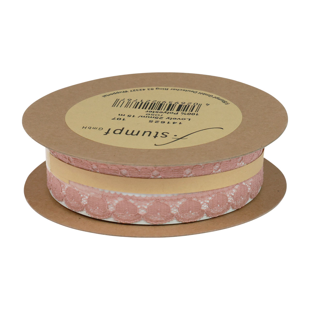 Krajková stuha se srdíčky ve starorůžové barvě je dodávána na ekologické kartonové roli. Pro ještě větší srdce můžete ozdobnou stuhu zkombinovat také s krajkovými stuhami v krémové nebo bílé barvě, které mají stejný vzor.