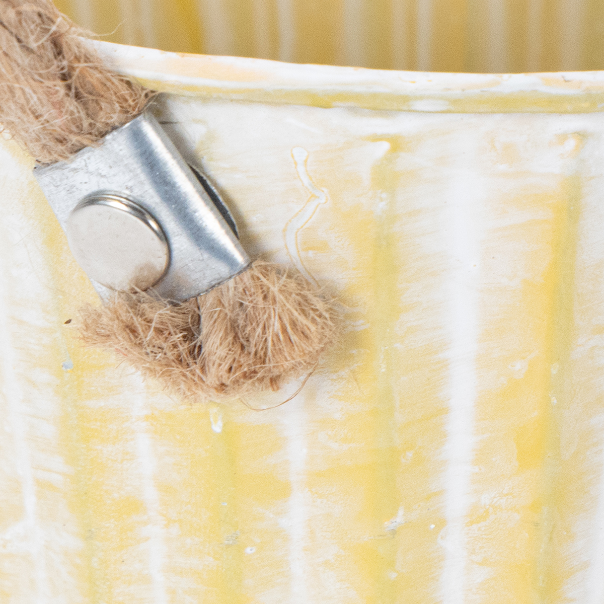 Tato sada pastelových květináčů je ideální pro jarní výsadbu! Kovové hrnce s jutovými uchy jsou prané v trendy shabby chic bílé a po celém obvodu jsou zdobeny rovnoměrným vertikálním vzorem proužků.