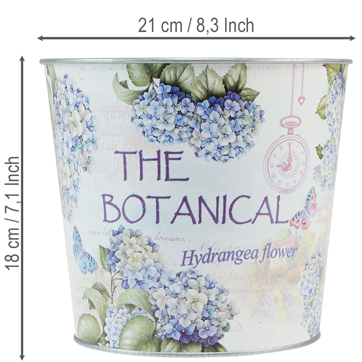 Dekorativní květináč je pozinkovaný a má kouzelný potisk pozdního léta. Vnitřek zůstává stříbrný. Před výsadbou byste měli nezapomenout vyložit nádobu fólií, aby nedošlo k dlouhodobému poškození vlhkostí nebo rzí.