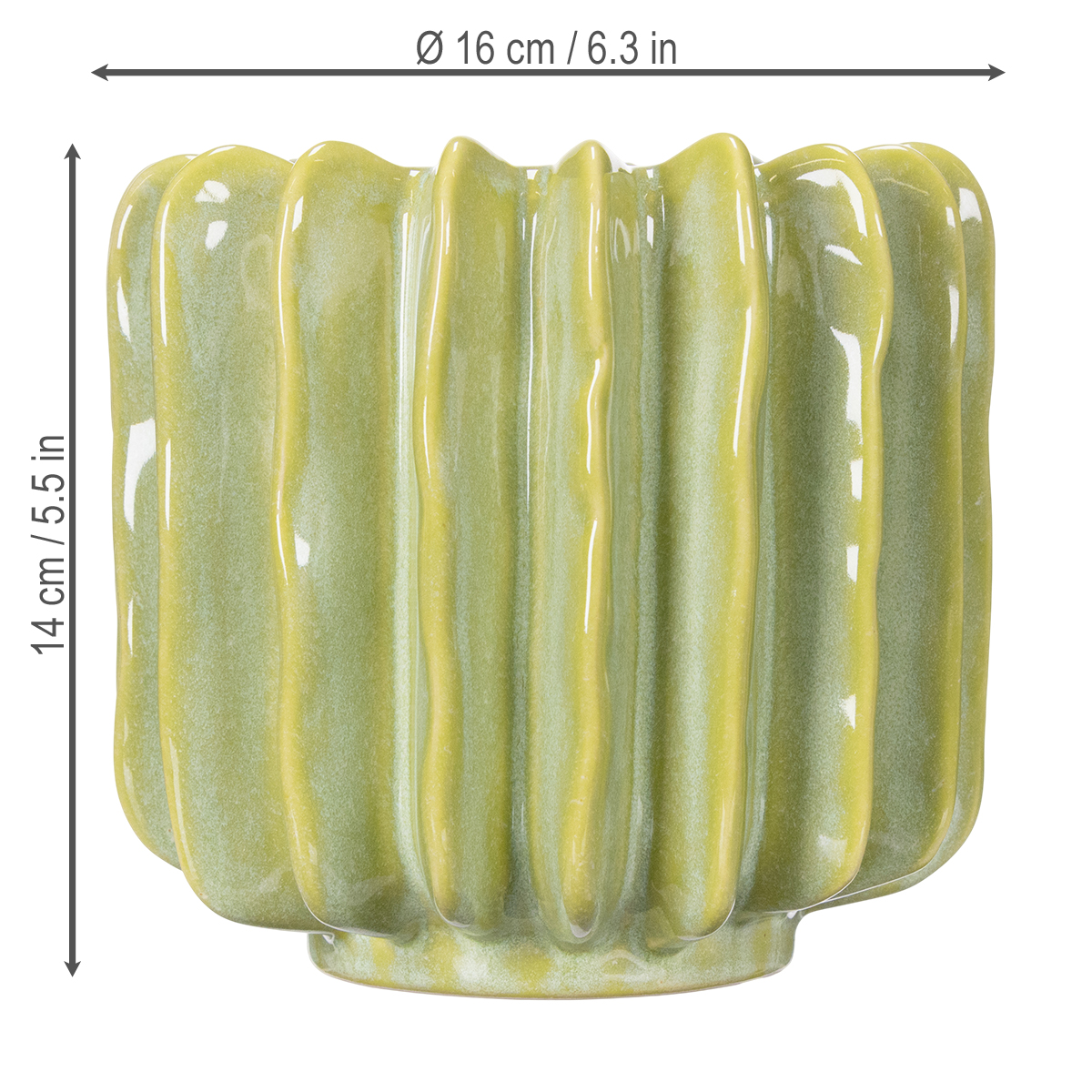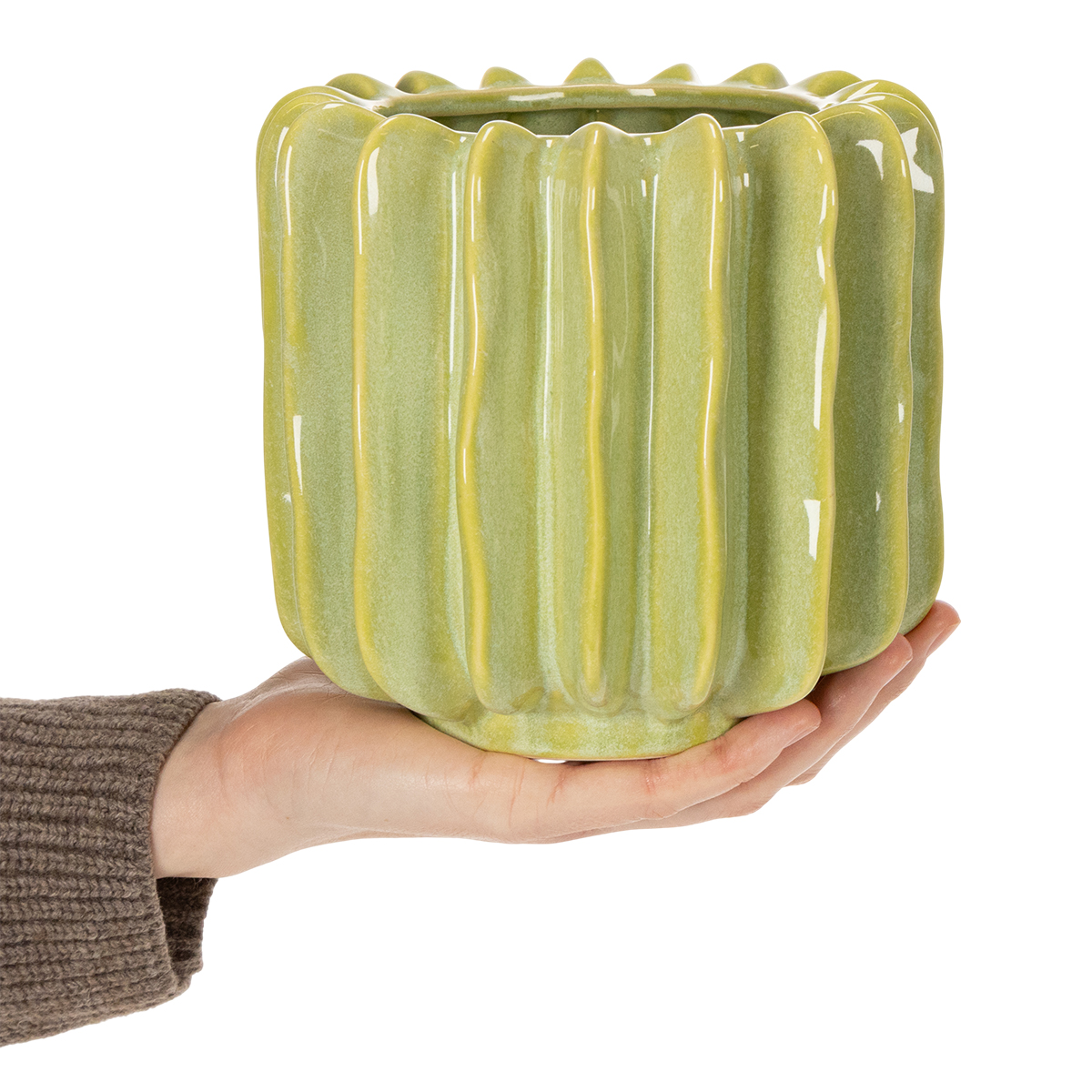 To je ale poutač! Tento zelený květináč s kaktusy je nejen krásný na pohled, ale také do vašeho domova vnese svěží a exotický nádech. Ať už jste fanouškem kaktusů, nebo máte prostě zálibu ve stylových bytových doplňkech, tento dekorativní kousek vás potěší. Harmonická zelená barva v kombinaci s jedinečným designem a výraznými drážkami dodá vašemu interiéru zvláštní lesk. Představte si, jak atraktivně bude tento 16cm keramický květináč vypadat na vašem parapetu, poličce v obývacím pokoji nebo dokonce na vašem stole. Dokonale kombinuje styl a funkčnost.