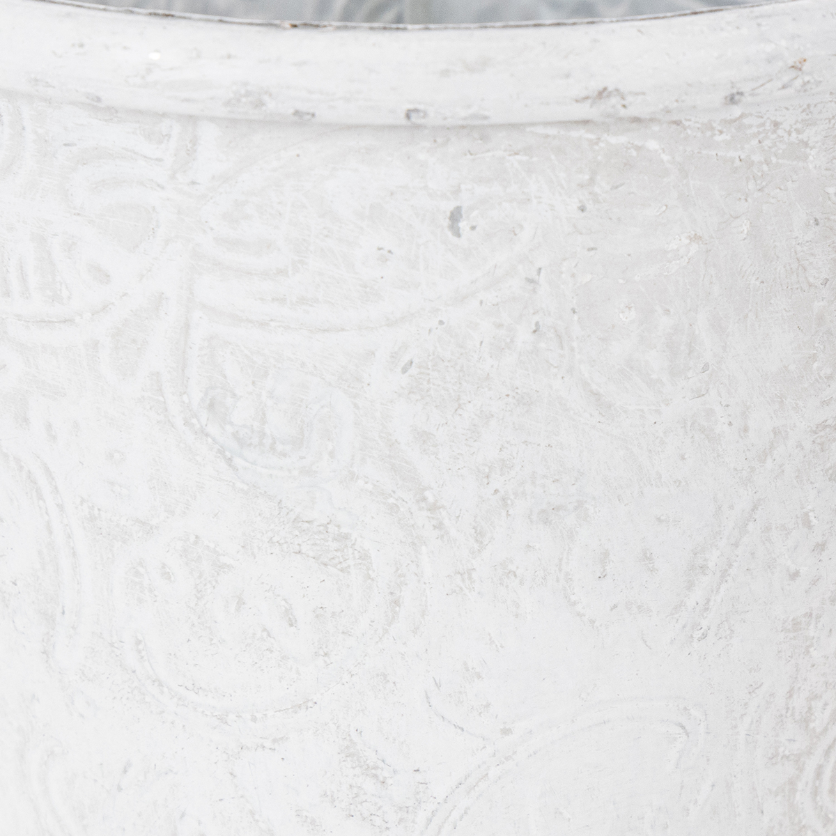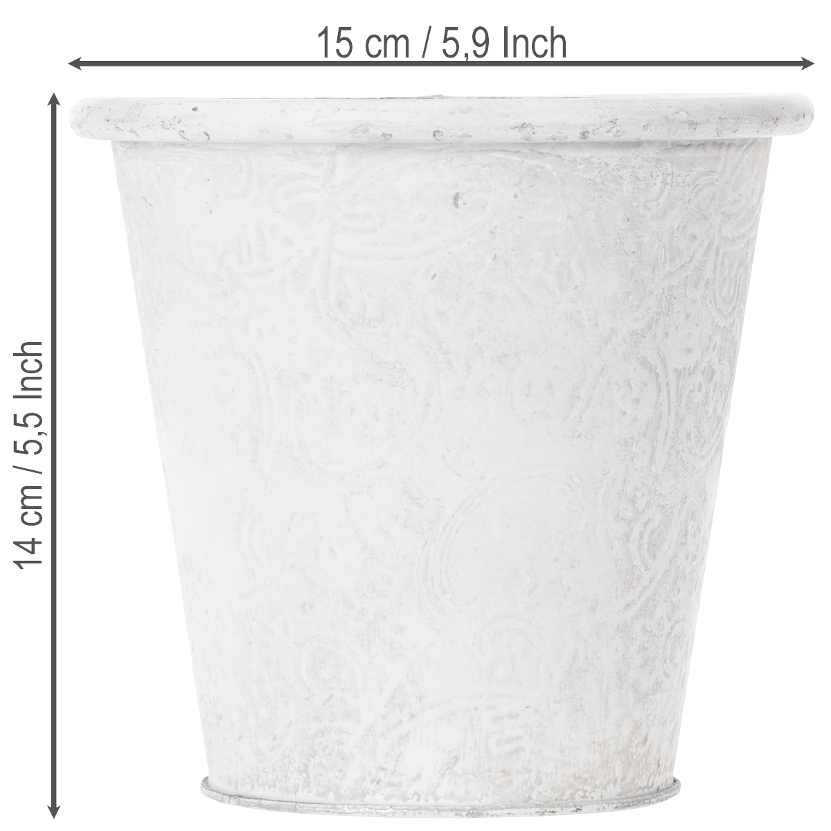 Tento květináč s vyraženými ornamenty v bílé barvě je nádherný květináč pro vaše oblíbené jarní květiny! Ale také široká škála náčiní, jako jsou pera, kosmetické štětce a štětce nebo malí zahradní pomocníci, najdou skvělé místo v této krásné kovové nádobě v trendy shabby chic!
