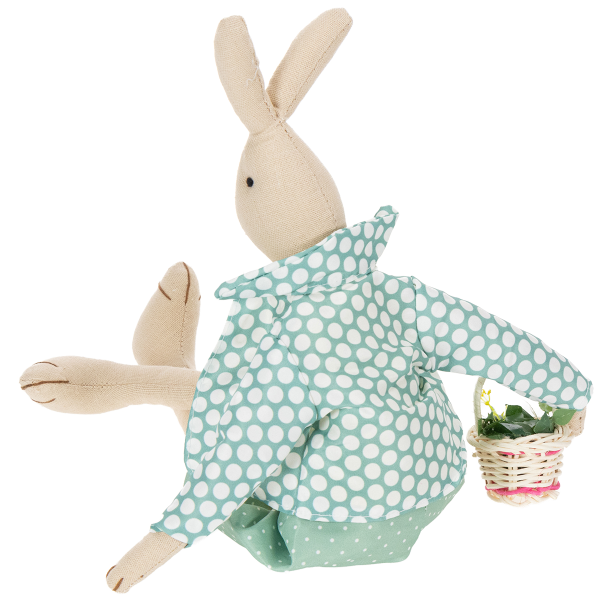 Tento zajíček byl ručně vyroben s velkým důrazem na detail. Zajíček byl ušitý z přírodní látky a měl na sobě žlutou košili s bílými puntíky a dřevěnými knoflíky, kalhoty a ladící sako v tyrkysové barvě, rovněž s tečkovaným vzorem. Velikonoční zajíček má na krku jednoduchou papírovou mašli. Králičí muž přinesl malý osázený košík s květinami.