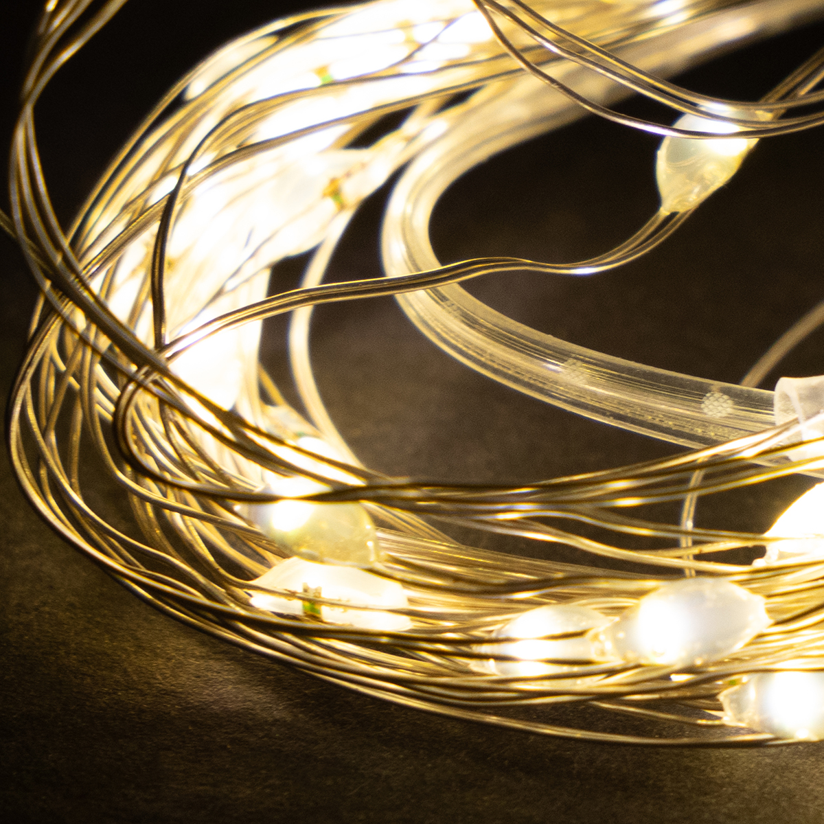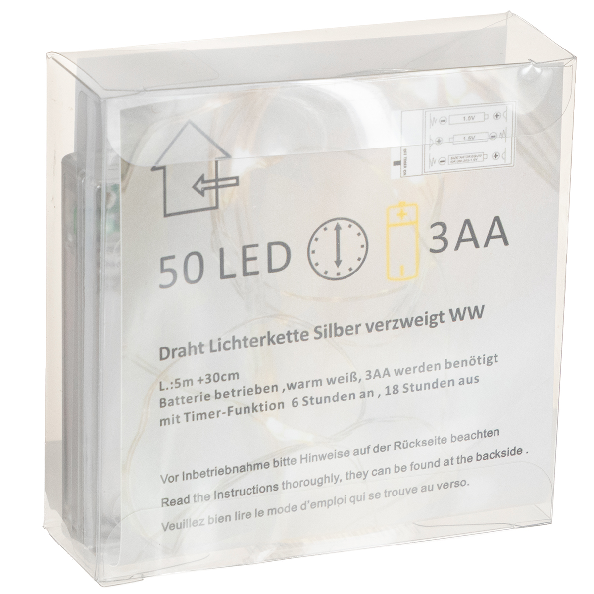 Tato 5 metrů dlouhá LED řetězová svítilna, napájená bateriemi a vyzařující teplé bílé světlo, vyžaduje k osvětlení svých 50 jednotlivých LED diod, které jsou od sebe vzdáleny 10 centimetrů, pouze 3 AA baterie. Přívodní vodič od baterií k první LED diodě je dlouhý 30 centimetrů.