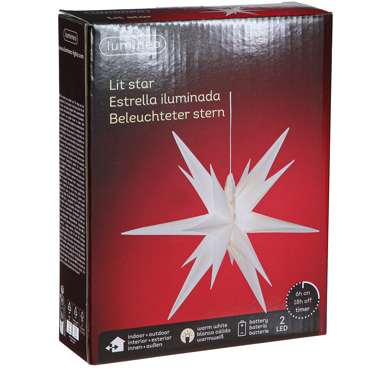 Vyzkoušejte různé možnosti použití s naší skládací LED vánoční hvězdou. Třída ochrany IP44 znamená, že přihrádka na baterie je mimo jiné odolná proti stříkající vodě. Díky tomu je vánoční hvězda ideální pro venkovní osvětlení. Jeho kvalitní zpracování z robustního plastu zaručuje dlouhou životnost a odolnost vůči povětrnostním vlivům. Bateriová LED hvězda o průměru cca 30 cm a délce zubu cca 14 cm se snadno nastavuje a sundává a nabízí další pohodlí s časovačem (6 hodin zapnuto, 18 hodin vypnuto).