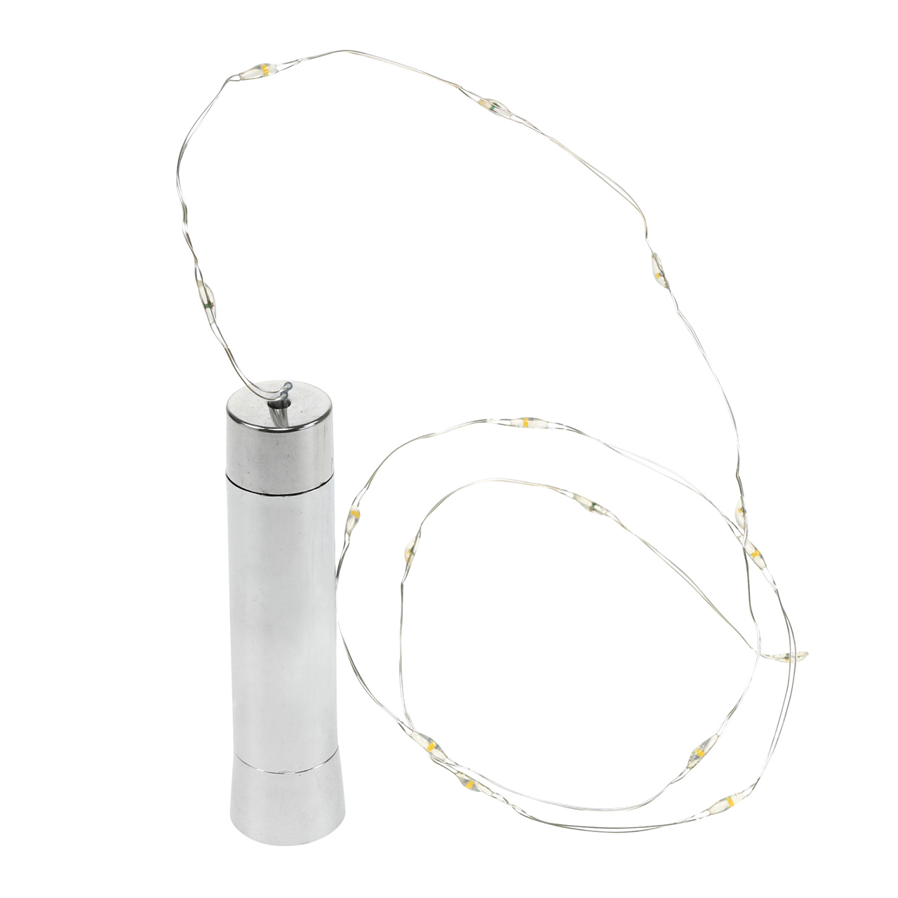 LED světlo na láhev v teplé bílé barvě má celkovou délku s uzávěrem přibližně 82 centimetrů. Na přibližně 73 centimetrů dlouhém řetězu světel sedí celkem 15 malých LED diod. Stříbrný uzávěr má nahoře průměr asi 2 centimetry a směrem ke dnu se mírně zužuje, aby zapadl například do hrdla lahve od vína. Dále potřebujete AA baterii pro osvětlení láhve.
