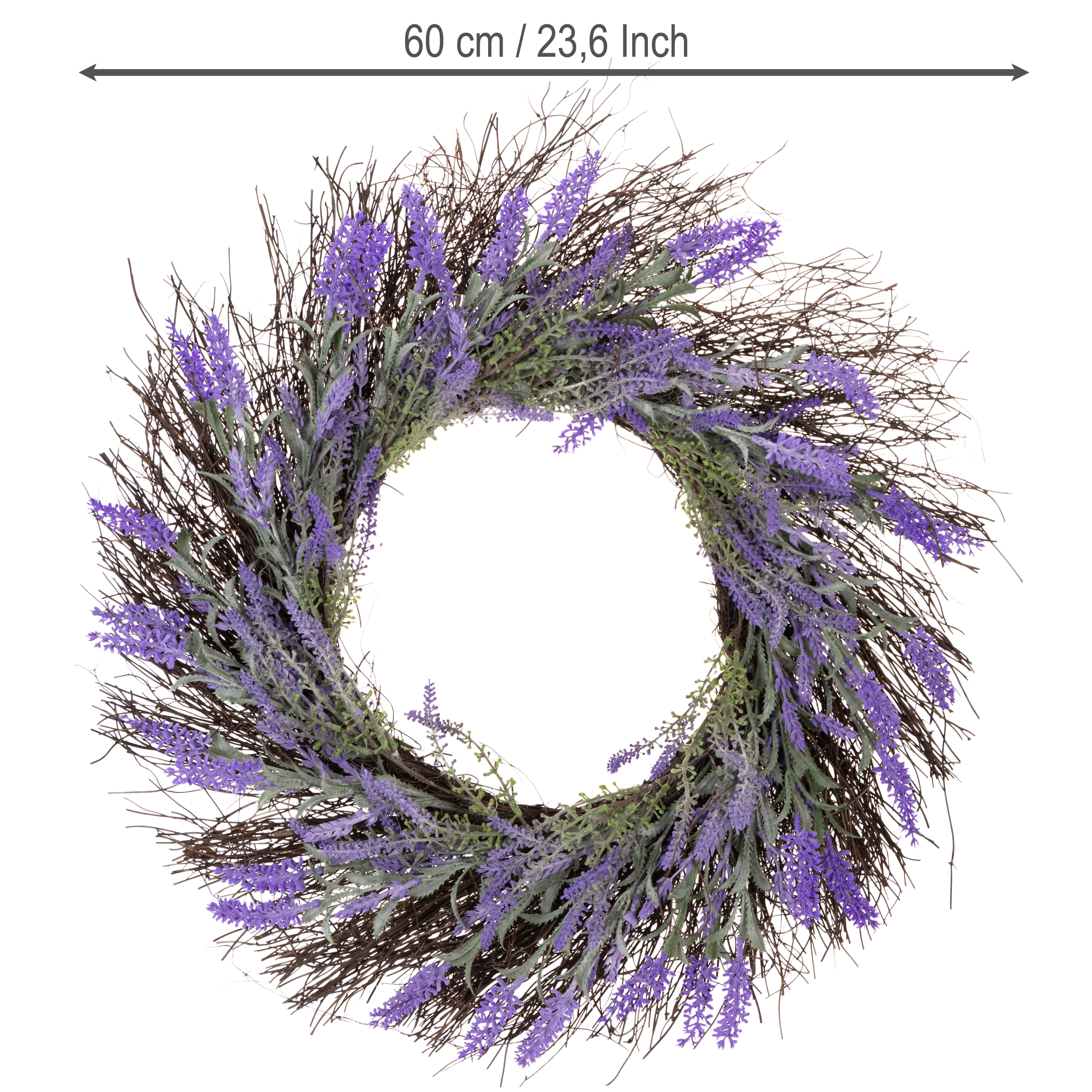 Levandulový věnec vyzařuje čistou eleganci. Jeho jemné barvy a přirozeně vypadající větvičky vinné révy z něj činí všestranný bytový doplněk. Použijte ho například jako dekoraci stolu se svíčkami a čerstvými květinami nebo jako jarní akcent na terase. Díky průměru 60 centimetrů působí výrazně, ať už je umístíte kamkoli, a přitom zůstává dostatečně neutrální, aby se bez problémů hodil do jakéhokoli prostředí.