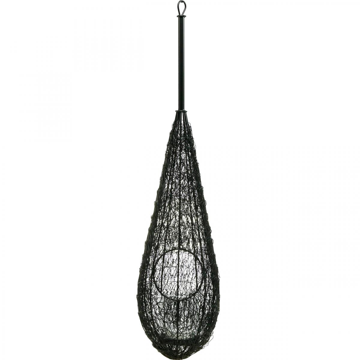 Závěsná lucerna působí nápaditě a tajemně. Závěsná dekorace je vyrobena z černého kovu. Jakmile do svíčky umístíte čajovou svíčku nebo malou sloupovou svíčku Světlo svíčky vrhá zajímavé stíny přes drátěné pletivo.Tvar lucerny připomíná strom, kapku nebo hnízdo. Skleněné stínidlo lze vyjmout kulatým otvorem a lucernu vybavit čajovou svíčkou. Filigránový svícen nebo svícen na čajovou svíčku končí bytelnou tyčí s masivním kroužkem jako věšákem.