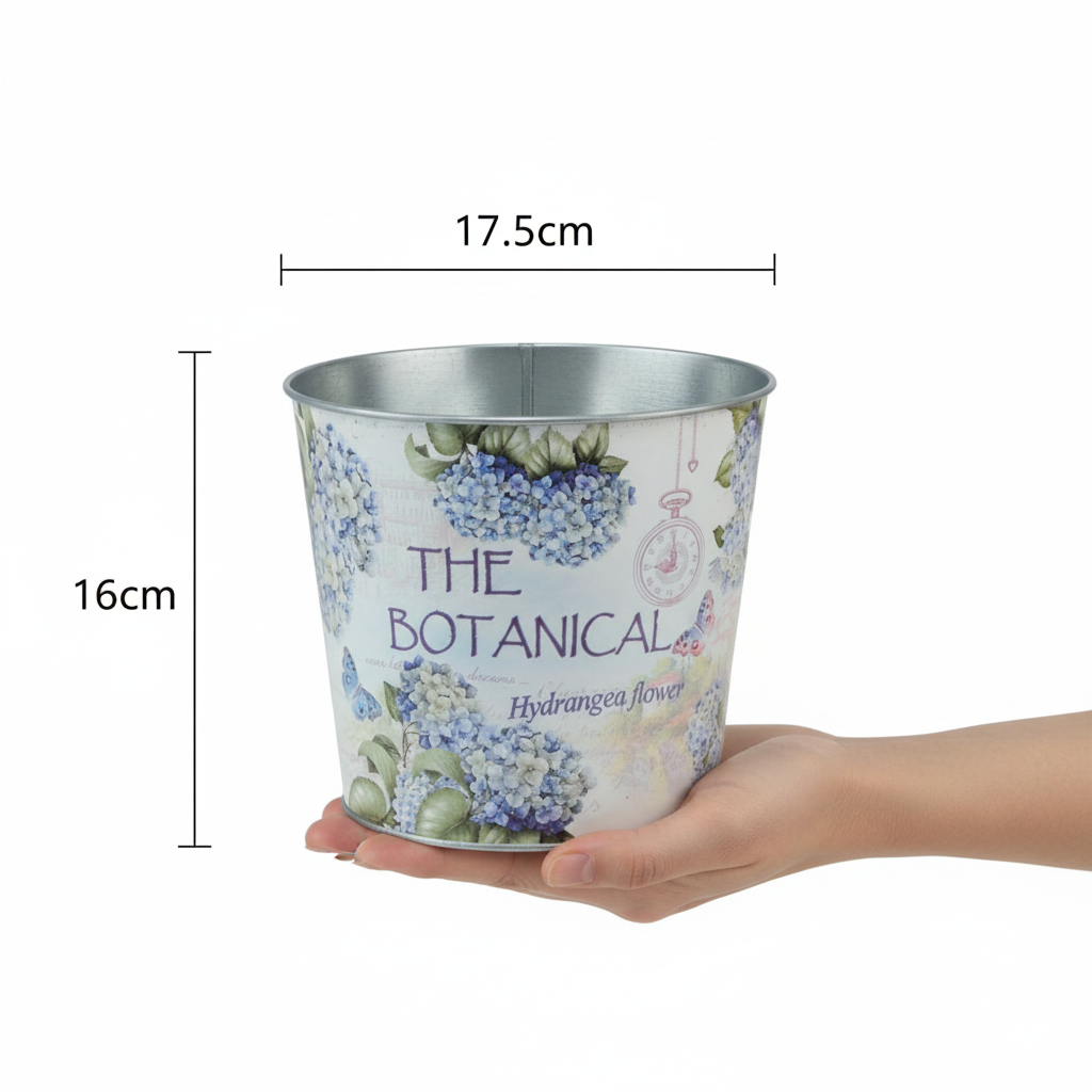 Tento kovový květináč překypuje letní nostalgií. Motiv hortenzie zdobí tuto úžasně všestrannou nádobu na květiny a rostliny v květináčích a je také ideální jako nápad na dárek od srdce.