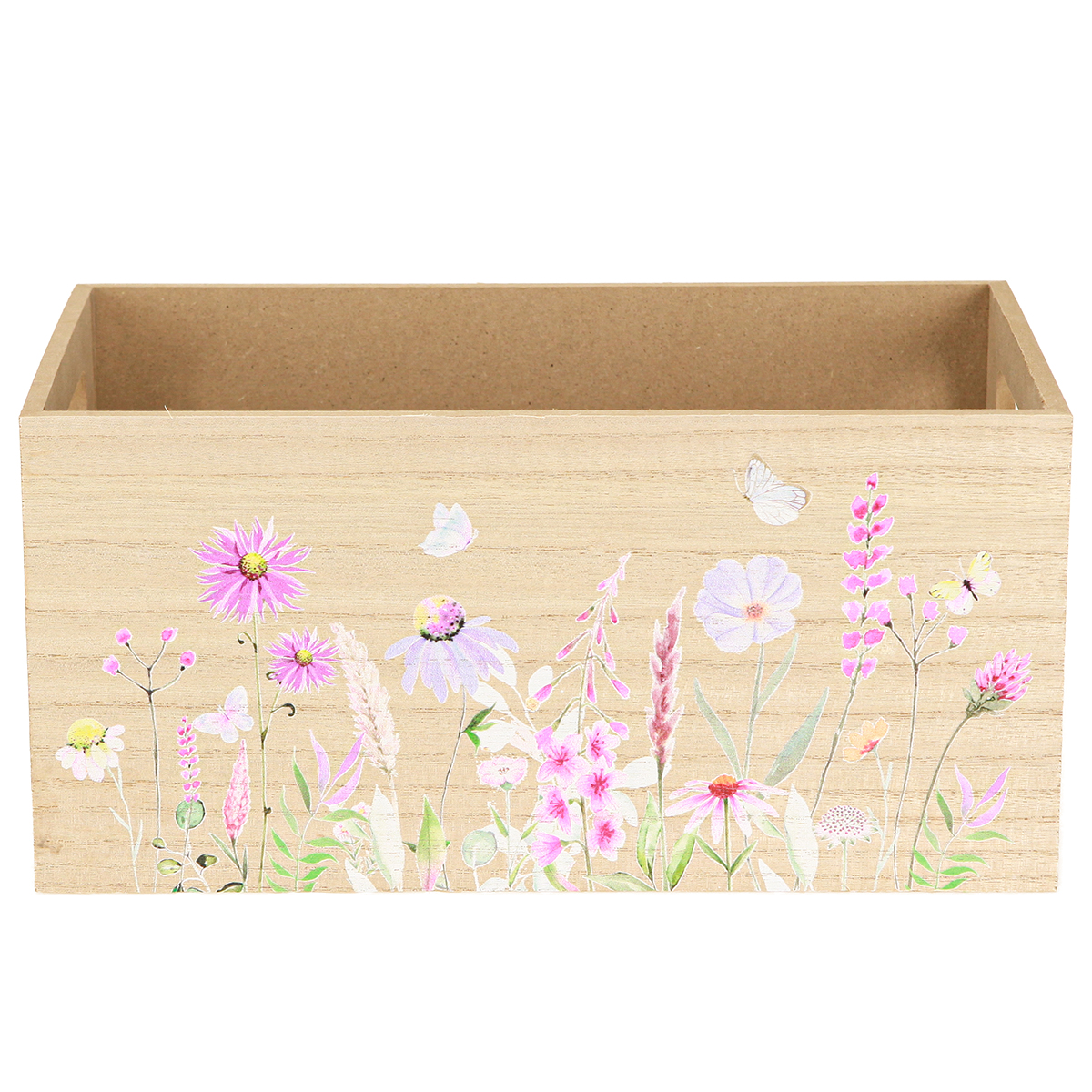 Naše malá dřevěná krabička v přírodním provedení je dodávána s květinami a motýly – ideální společník pro vaše nápady na sezónní dekorace. Se svým kouzelným designem fialových a růžových kvetoucích květin, obklopených zelenými trávami a barevnými motýly, vytvoří ve vašem domově snovou atmosféru. Tato všestranná dřevěná krabička vyrobená z robustního dřeva kombinuje funkčnost a estetiku. Zejména na jaře a v létě se stává poutačem každé dekorace stolu a poskytuje nádech venkovského stylu. Boční madla usnadňují přepravu a uspořádání truhlíku, který svůj úkol zvládá na výbornou jak jako úložný box na drobné zahradní nářadí, tak jako dekorativní truhlík na rostliny. Tato dřevěná krabička, která je šetrná k životnímu prostředí a je stylová, nejenže udrží váš pokoj uklizený, ale také vyzařuje harmonickou přirozenost. Dekorativní kus se hladce začlení do různých stylů interiérového designu a elegantně vylepší vaše životní prostředí.