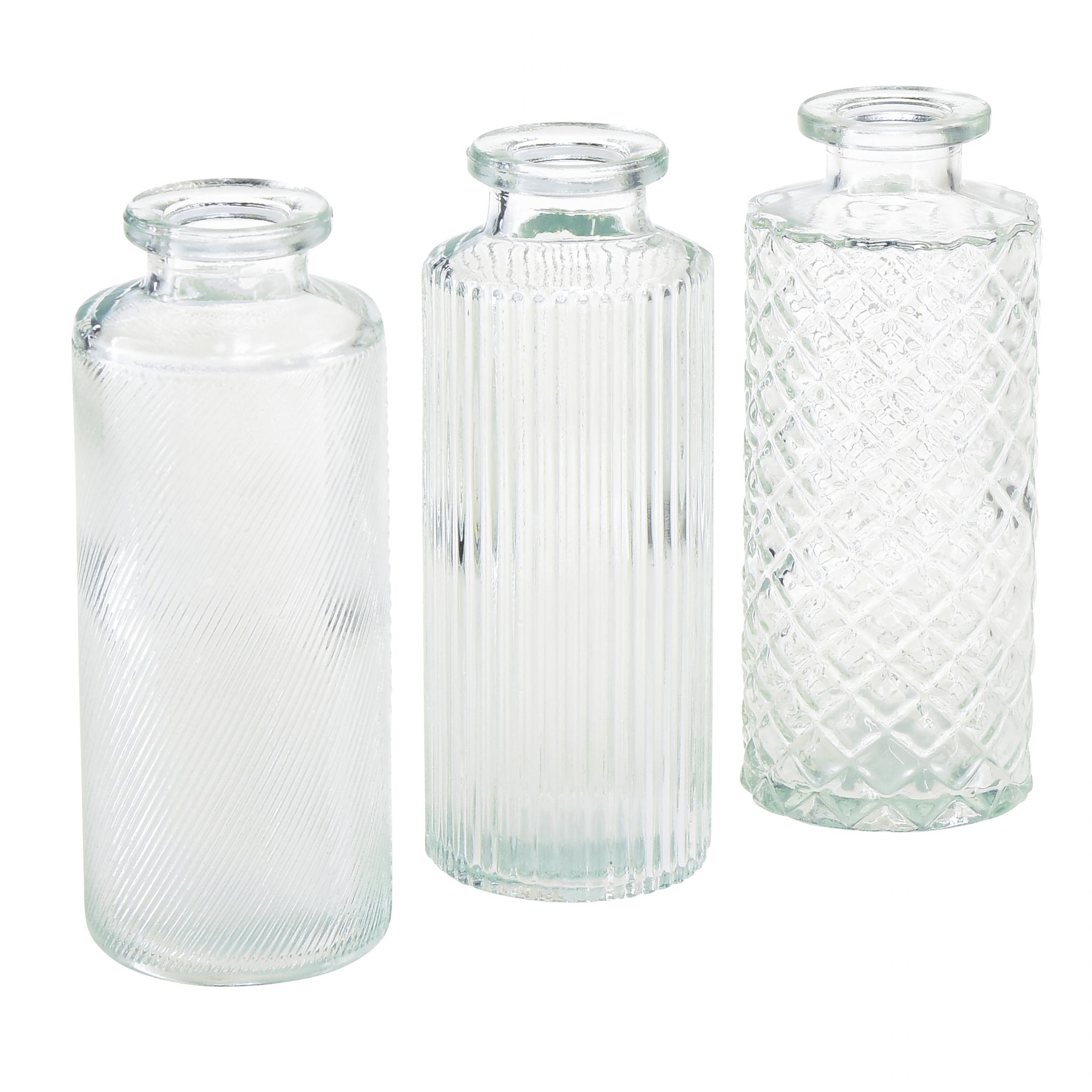 Láhvové vázy obdržíte v sadách po 3 kusech se třemi různými vzory. Skleněné mini vázičky mají průměr přibližně 5 centimetrů a jsou přibližně 13 centimetrů vysoké.