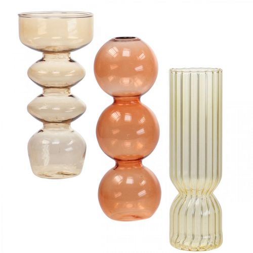 Tato sada obsahuje tři mini skleněné vázy. Skleněné vázy se dodávají ve třech různých tvarech a barvách. Vystavte zkrácené květiny v dekorativních skleněných vázách.S touto sadou získáte žlutou, oranžovou a nahnědlou minivázu. Žlutá ukazuje krásný lamelový retro reliéf a štíhlý tvar. Oranžová dekorativní váza je naopak navržena se třemi křivkami v romantickém kulovém tvaru. Malá hnědá skleněná váza dokonce připomíná skleněný držák na čajovou svíčku.