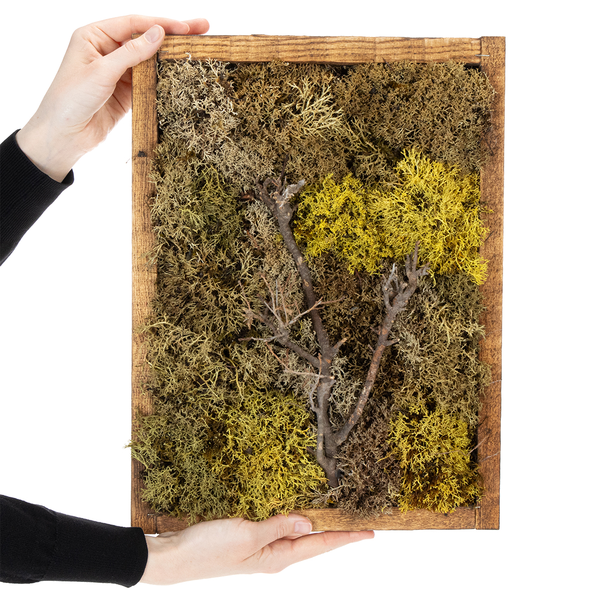 Objevte uklidňující účinek skutečného mechu ve stylovém rámu. Náš zachovalý mechový obraz je perfektní zelenou nástěnnou dekorací pro každou místnost - ať už je to obývací pokoj, kancelář nebo meditační místnost. S unikátním vzorem ježčího mechu v různých odstínech zelené a ústředním motivem větví bude mechové umělecké dílo poutačem pro oči ve vašem interiéru.