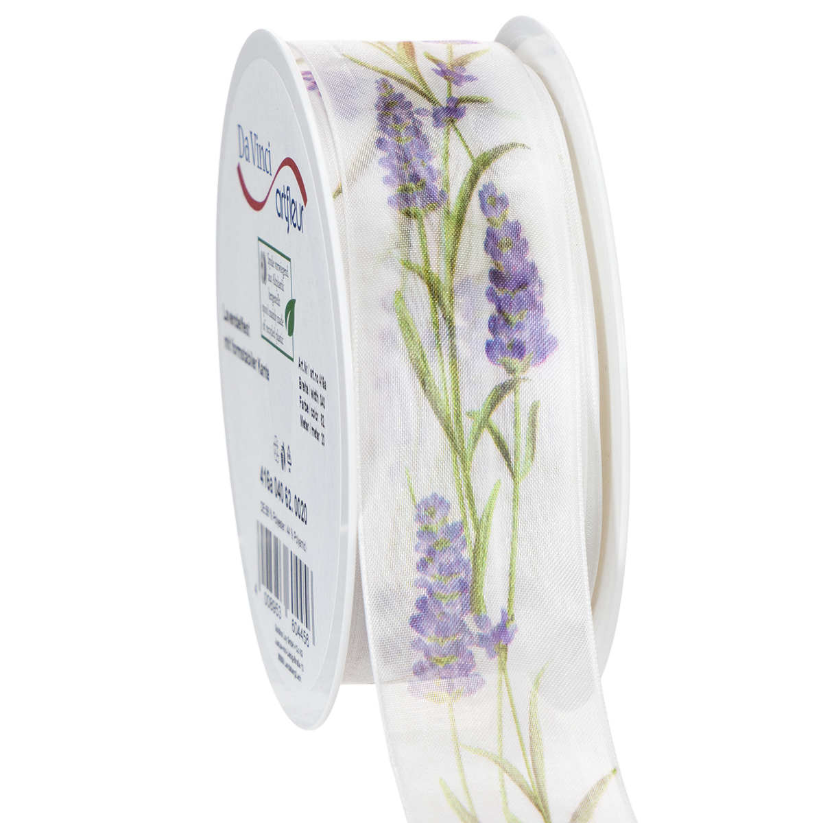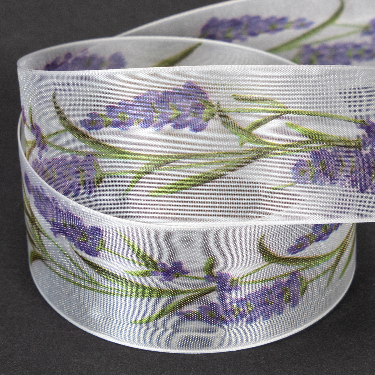 Motiv levandule působí na bílém podkladu organzové stuhy svěže a barevně. Díky průhledné organzové vazbě je šifonová stuha lehká a má charakteristický třpyt, zatímco okraje držící tvar zajistí, že mašle vypadají malebně.