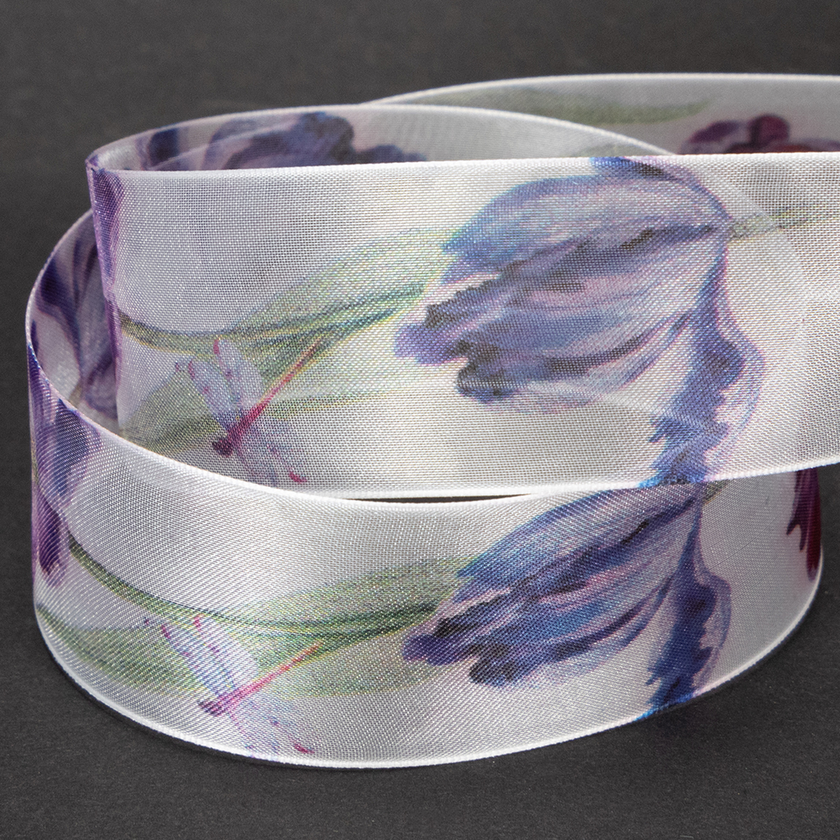 Motýli, vážky a zelené listy rámují kresby fialových papouščích tulipánů na ozdobné stuze. Transparentní organzová látka dodává šifonové stuze vzdušný a přitom lesklý vzhled, zatímco rozměrově stálé okraje zajišťují, že mašle zůstávají stabilní a na obalech a věncích vypadají optimálně.