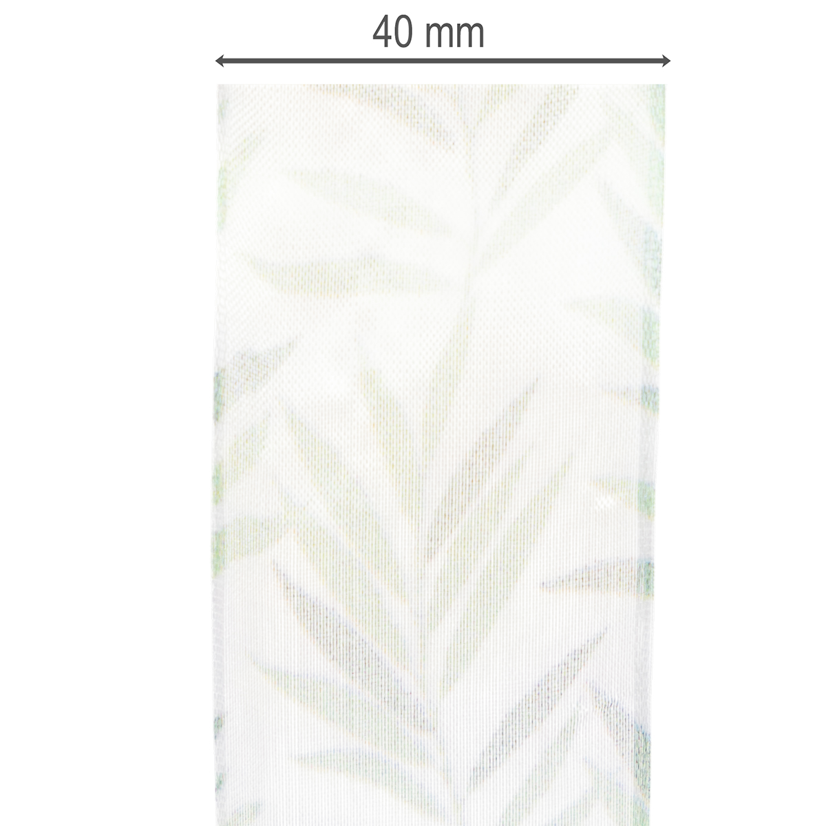 Svěží, exotické listy v jemně odstupňovaných odstínech zelené vytvářejí na bílém průhledném pruhu pocit džungle. Transparentní organzová látka dodává šifonové stuze lehký a jemný vzhled, zatímco rozměrově stabilní okraj zajišťuje, že mašle vždy zůstanou ve špičkovém tvaru.
