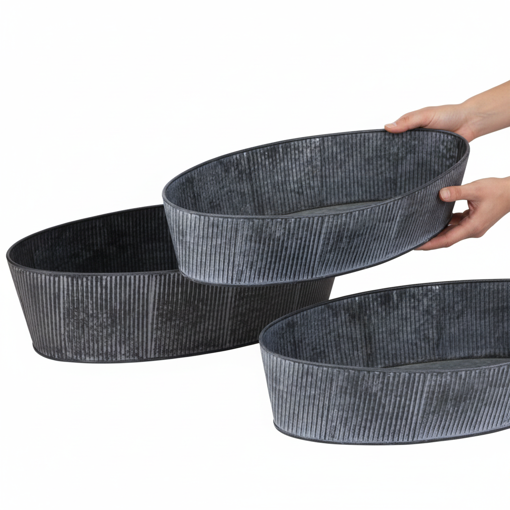 Oválná mísa z kovu a černé barvy kombinuje stylovou eleganci s okouzlující vintage estetikou, která vylepší váš domov. Ať už jako nápadná dekorativní mísa, jako nostalgická dekorace na stůl nebo jako rustikální květinová mísa – tato sada dvou stohovatelných kovových mís otevírá četné kreativní možnosti. Elegantní barevné provedení v černé, seprané šedé, stejně jako design jemných drážek dokonale ladí s každým interiérem shabby chic nebo industriálním stylu. Použijte misky jako misky na rostliny a dodejte zelený melír pokojovými rostlinami nebo bylinkami. Menší z nich je ideální pro stylové úložiště klíčů nebo pro sukulenty.