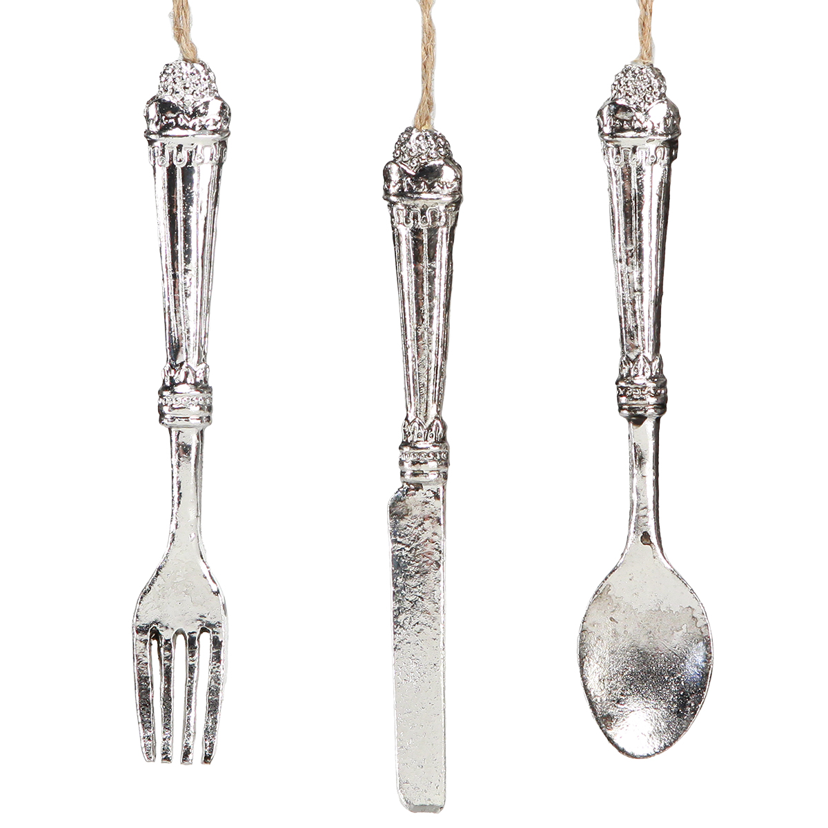 Příborová dekorace na zavěšení kovový vzhled stříbrná 14cm 12 ks