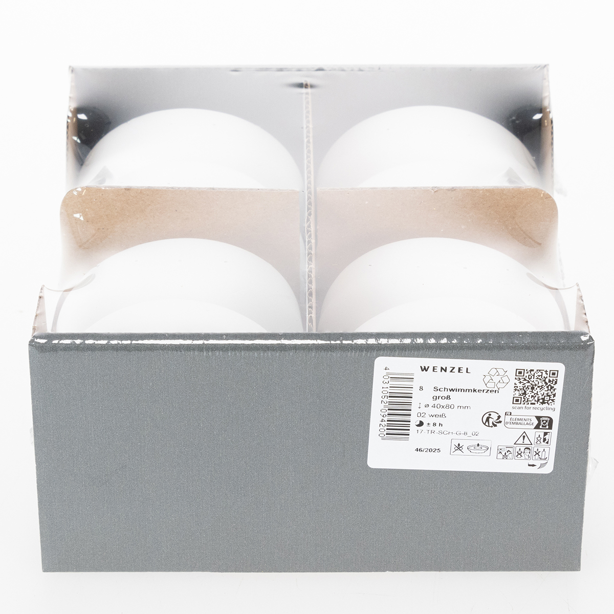 Bílé voskové plovoucí svíčky se dodávají v sadě po 8 kusech. Každá svíčka má průměr přibližně 8 centimetrů a výšku 4 centimetry, s dobou hoření přibližně 8 hodin.