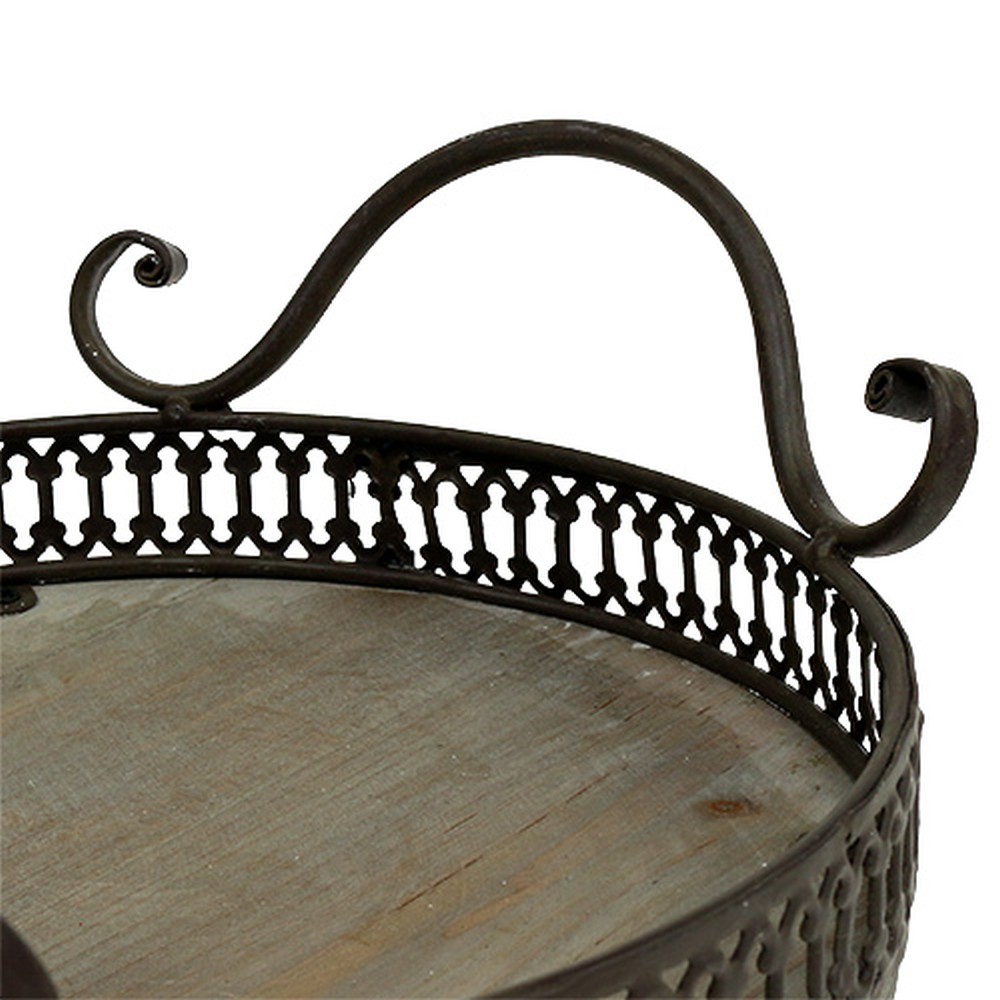 Podnos s uchy v hnědé barvě se skládá z kulaté dřevěné desky, na kterou je přišroubováno jakési zábradlí s uchy. Deska má pak průměr kolem 20 centimetrů a s prohnutými kovovými úchyty výšku kolem 8,5 centimetru.