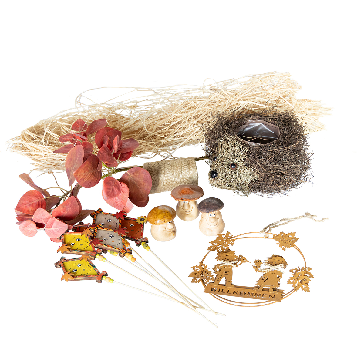 Naše sada podzimních dekorací v sobě spojuje vše, co potřebujete pro atmosférickou podzimní výzdobu. Tento roztomilý ježek z vinné révy bude poutavým prvkem v rustikálních a útulných místnostech – ideální pro venkovský styl. Doplňují ho miniaturní houby v teplé hnědé, béžové a rezavě červené barvě, hravé květinové štiky, praktický jutový provázek, realistické červené podzimní listí jako umělé rostliny a rezavě zbarvená uvítací cedule.