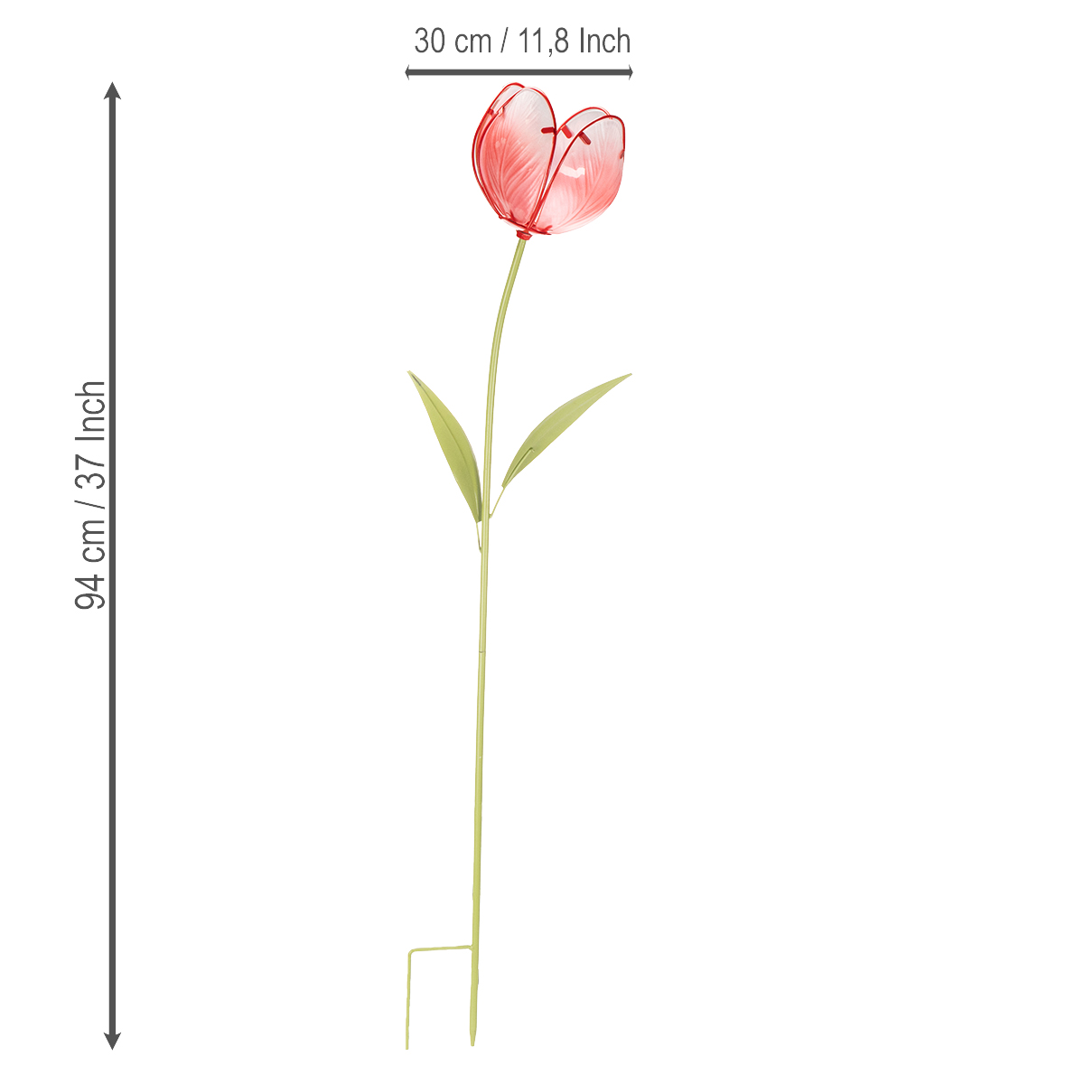 Skleněný zahradní kolík ve tvaru tulipánu zaujme nejen svým estetickým designem. Díky svým velkorysým rozměrům o výšce 94 cm a průměru 13 cm dodá výrazný akcent každému venkovnímu prostoru. Zářivě červený tulipán je vyroben z pevného skla, které je odolné vůči povětrnostním vlivům a trvanlivé (i když ne mrazuvzdorné).
