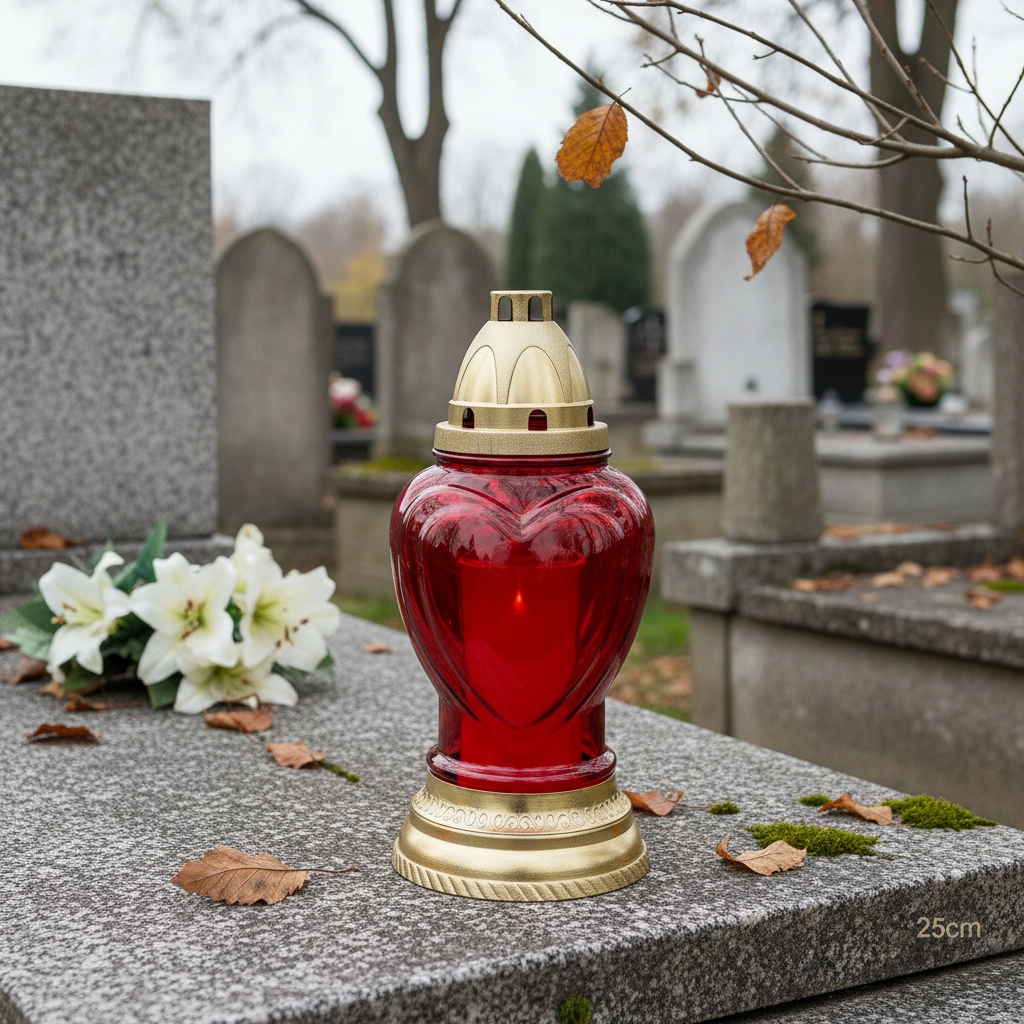 Náhrobní lucerna je z obou stran zdobena nadčasovým reliéfem srdce, který náhrobním světýlkům dodává stylový vzhled. Víko a základna jsou vyrobeny z plastu a mají také krásný tvar.