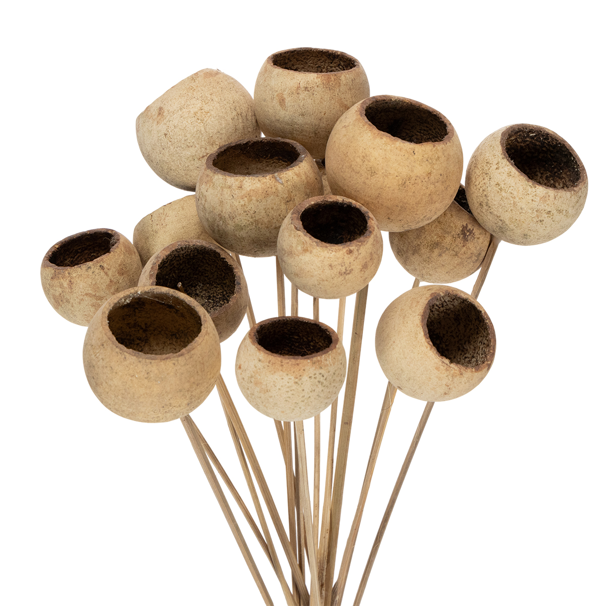 Zvonkový pohár svým jedinečným tvarem připomíná vydlabanou dekorativní dýni a je proto oblíbenou součástí zvláště přírodní dekorace. Tento Bell Cup Mix na stopce v přírodních barvách má další výhodu v tom, že vydlabané plody různých velikostí jsou připevněny na pevných dřevěných tyčkách a lze je tedy snadno a s mnoha fazetami zpracovat. Stonky zafixujte například do ucpávkové hmoty a dodejte tak rustikálním podzimním květinovým aranžmá velmi zvláštní nádech.