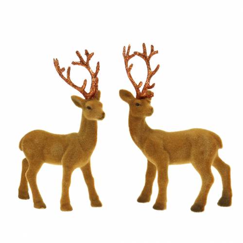 Osm kopyt dvou sobů v kari úhledně kráčí bílým umělým sněhem na vašem vánočním stole, všude kolem jsou zasněžené, jiskřivé ozdobné jedle. - Takovou zimní scénu byste mohli vytvořit s pomocí hejnového sobího páru značky VIANA.Tělo dvou dekorativních sobů je poseto vysoce kvalitní tenkou srstí. Ústa a nos jsou jemně vykresleny černě, na kopytech je černě ztmaveno i hejno. Jejich parohy jsou hustě potaženy třpytivou vrstvou měděné barvy a fóliovými zrcadly stejné barvy. Jeden ze sobů se těší, druhý má hlavu otočenou dozadu. Oba mají výrazné hnědé umělé oči. Díky nízké hmotnosti a měkké vnější vrstvě lze figurky snadno umístit i na citlivé povrchy.