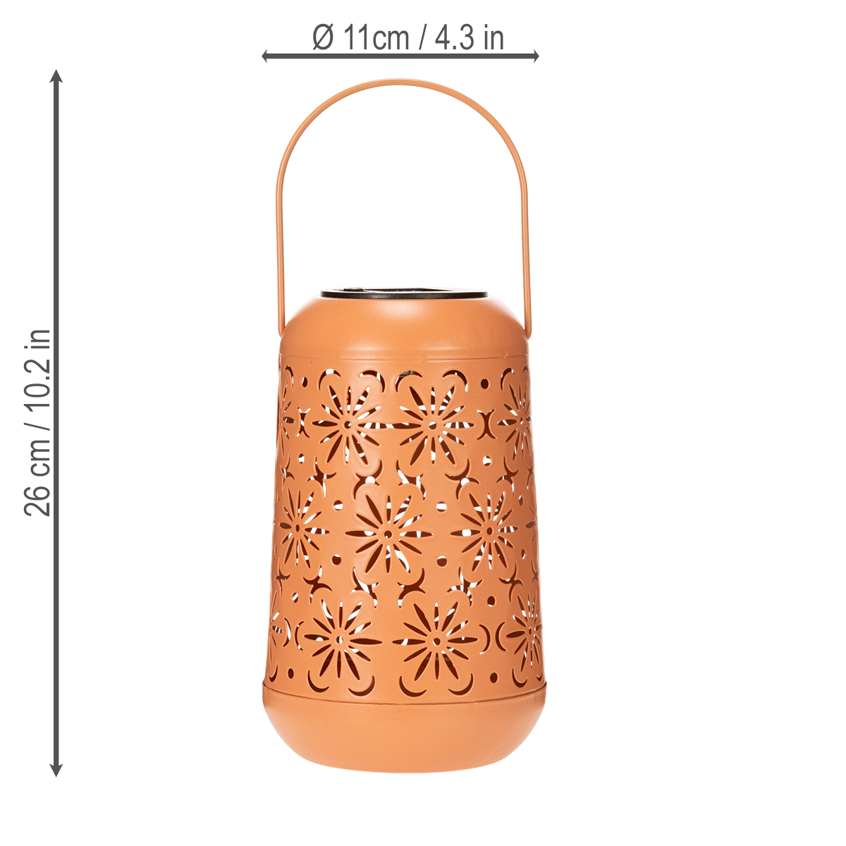 Díky teplému světlu a květinovému vzoru vytváří tato solární lucerna příjemnou atmosféru v jakémkoli venkovním prostoru. Jemné květinové vzory dodávají zahradě nádech elegance a nádech bohémského stylu. Vysoce kvalitní řemeslné zpracování v decentním oranžovém odstínu dokonale ladí s moderními i klasickými zahradními styly. Ať už chcete vytvořit romantické světelné akcenty za vlídných letních večerů, ozdobit si terasu stylovým osvětlením nebo hledáte dekorativní řešení pro zahradní párty – tato venkovní solární lampa je více než jen zdroj světla. Je to vrchol každého venkovního prostoru.