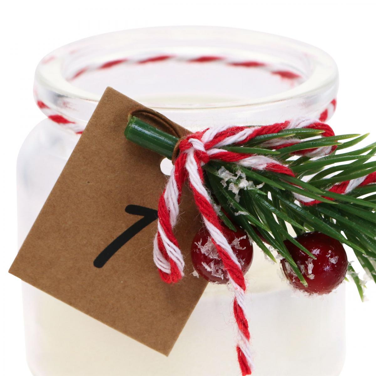 Sklo svíčky zdobí červenobílý pruhovaný pás. Na stuhu je přivázána malá zelená borová větvička a větvička s drobnými bobulemi cesmíny. Díky třpytu na něm vypadají větvičky a bobule ledově. Malá kartonová kartička ukazuje číslo 1 až 4. Vždyť každou neděli během adventu svítí jen jedna svíčka.