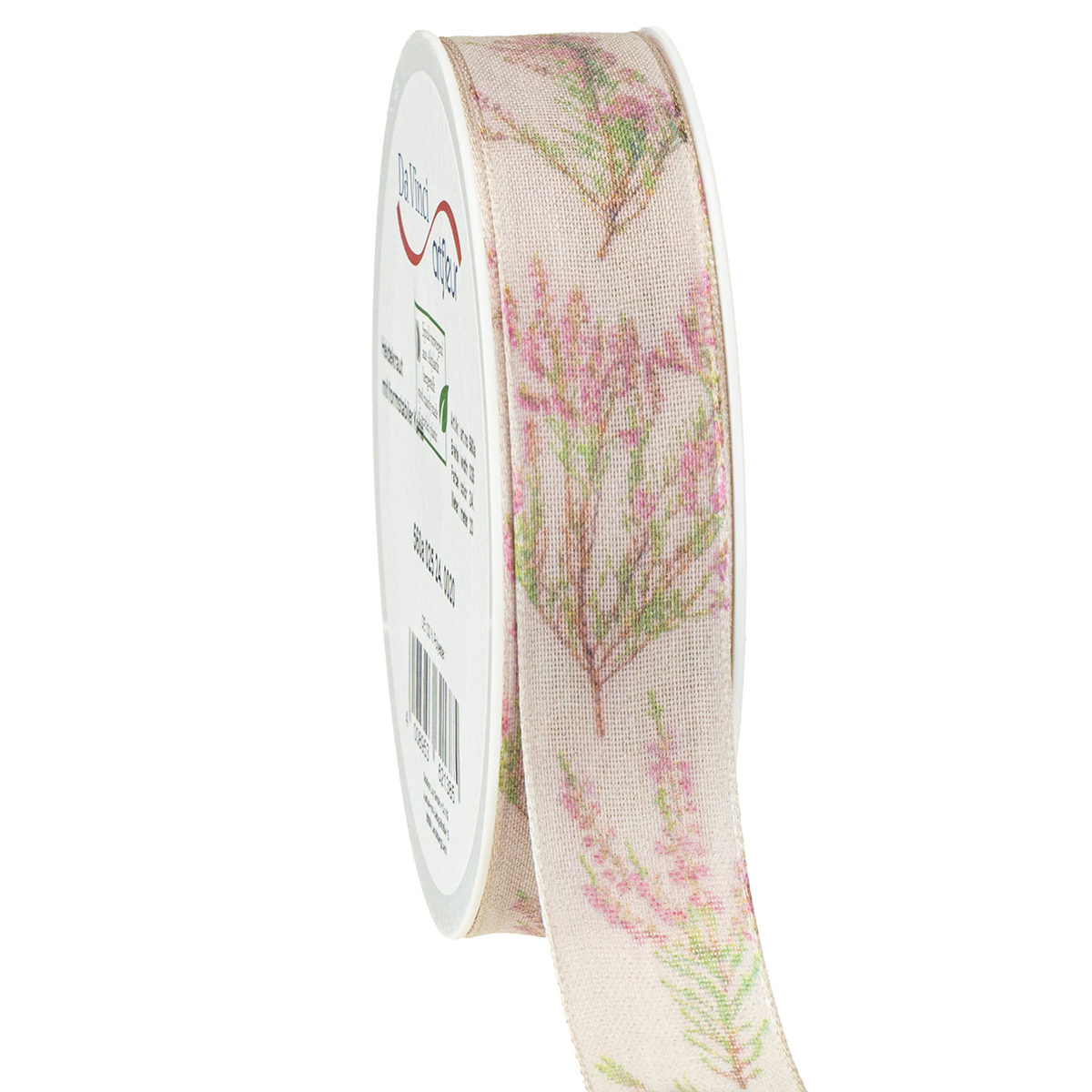 Na lehce průhledném bílém podkladu s růžovým nádechem je zobrazen vřes (Erika) jako kvetoucí keř. Ozdobná stuha má tvarově stálý lem. To znamená, že stuha se na okraji netřepí a má optimální obalové a dekorační vlastnosti.