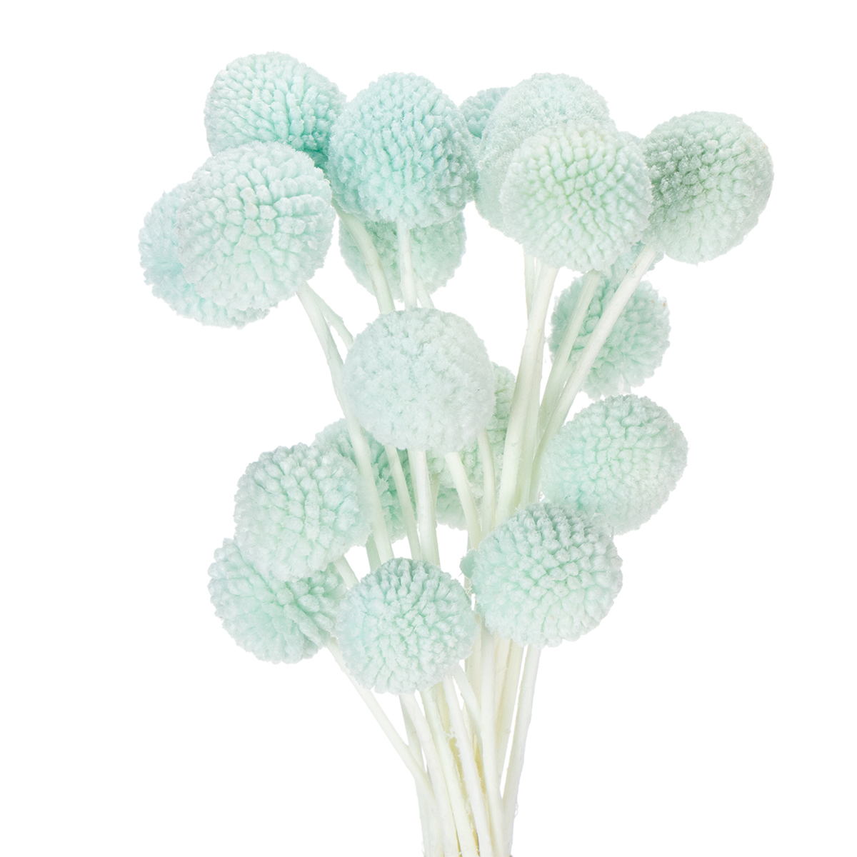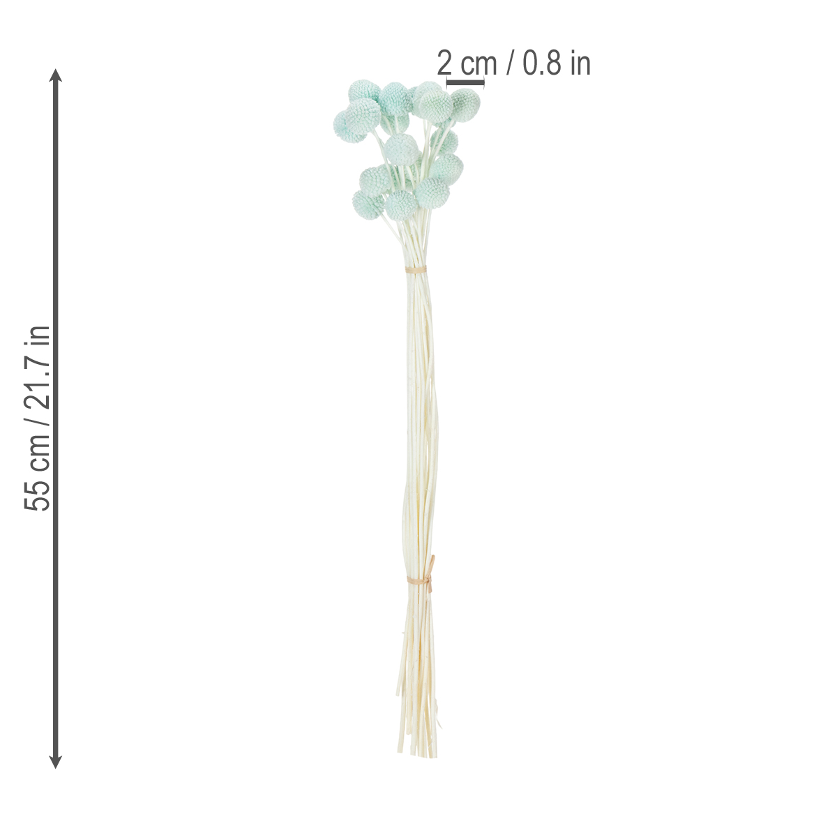 Květy rodu Craspedia mají průměr asi dva až tři centimetry, což z kytice dělá atraktivní ústřední prvek. Přírodně zbarvené stonky vytvářejí okouzlující kontrast se zářivou mátově modrou. Kytice vypadá obzvláště dekorativně v minimalistických vázách nebo jako doplněk většího aranžmá s jinými sušenými květinami. Pro vzdušný a moderní vzhled ji zkombinujte například s pampovou trávou nebo eukalyptem.