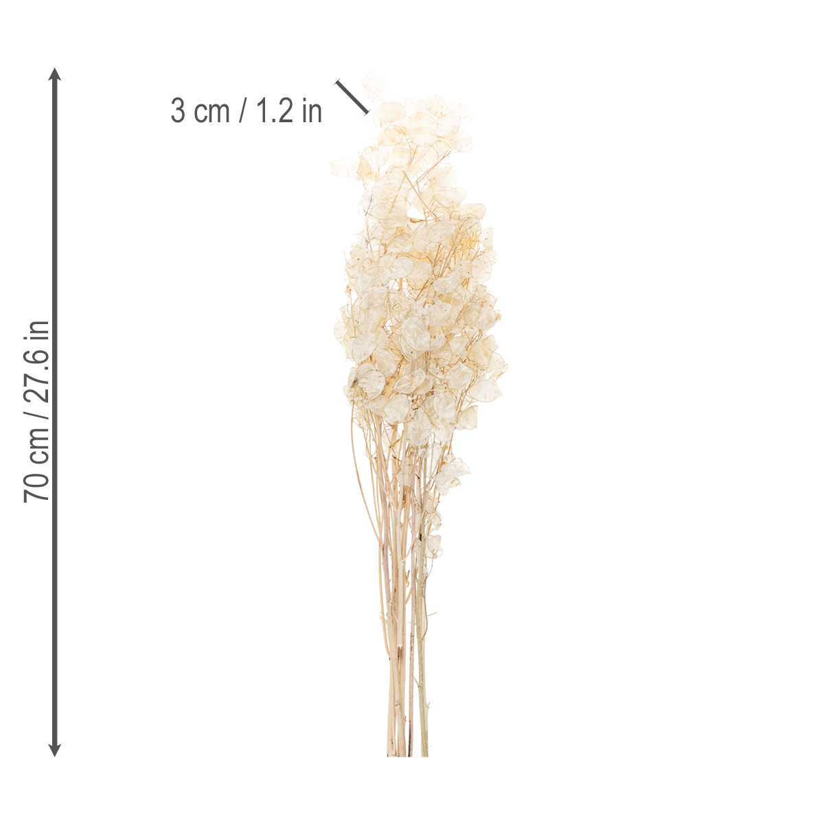 Pokud si koupíte sušený stříbrný list Lunaria, obdržíte několik větví suché dekorace ve svazku o čisté hmotnosti kolem 30 gramů v květinové fólii.