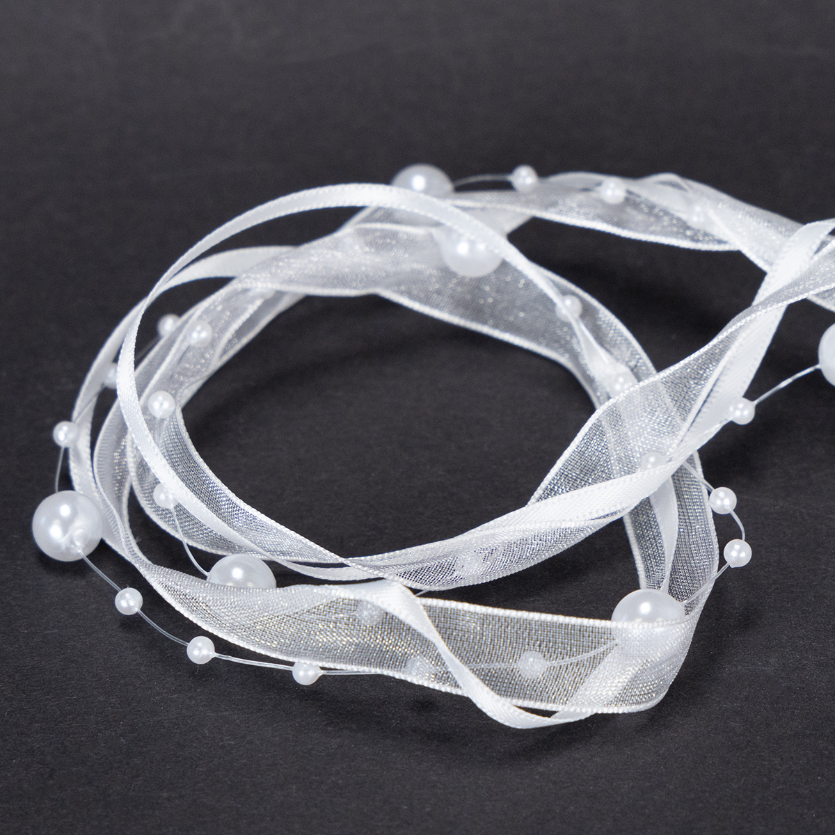 Snubní prsten v bílé barvě má délku cca 5 metrů a je navinutý na roli z plastu. Šířka je asi 20 milimetrů a korálky mají průměr asi 0,2 až asi 0,8 centimetru.