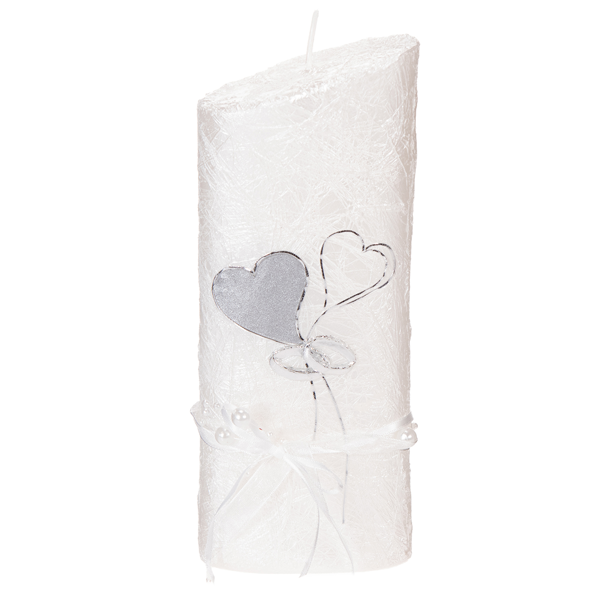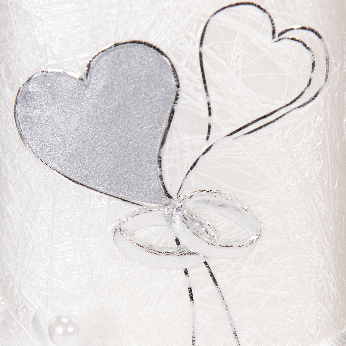 Dvě srdce na stoncích drží pohromadě jako kytici květin dvěma propletenými kroužky. Svatební svíčka je také ozdobena bílou stuhou a perlami, což ve svatební výzdobě vypadá krásně. Tuto ozdobu je však nutné před zapálením svíčky odstranit.
