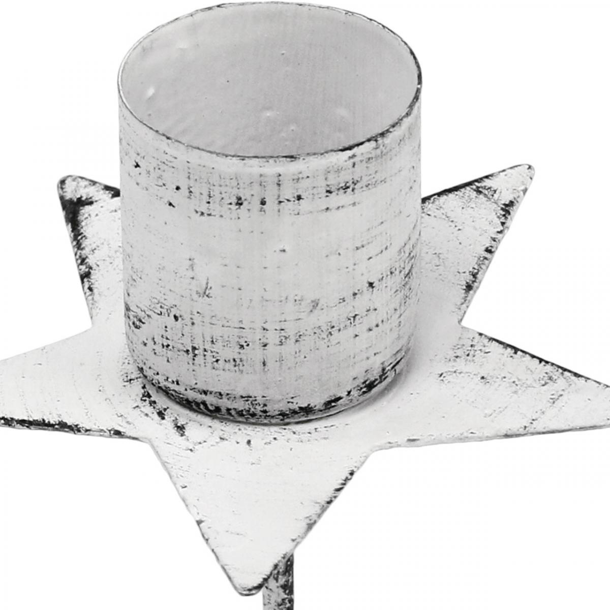 Bílý kovový svícen se vyznačuje moderním shabby chic designem, díky kterému se perfektně hodí k přírodním vánočním dekoracím ve venkovském stylu. Dlouhý držák s hroty usnadňuje zasunutí svíce do květinových pěnových nebo slaměných věnců. Svícen lze také zasunout do nádob naplněných zeminou nebo dekorativním pískem a vytvořit tak hvězdu.