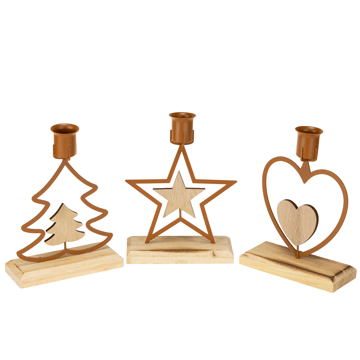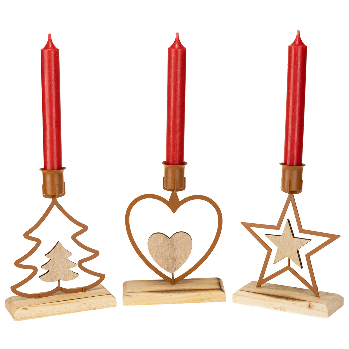 Silueta rezavě hnědě lakovaného kovu se svícnem na dlouhé svíčky sedí na jemně flambovaném podstavci z přírodního dřeva. Uprostřed pod svícnem je opět vidět hvězda, srdce a vánoční stromeček jako dřevěné motivy.
