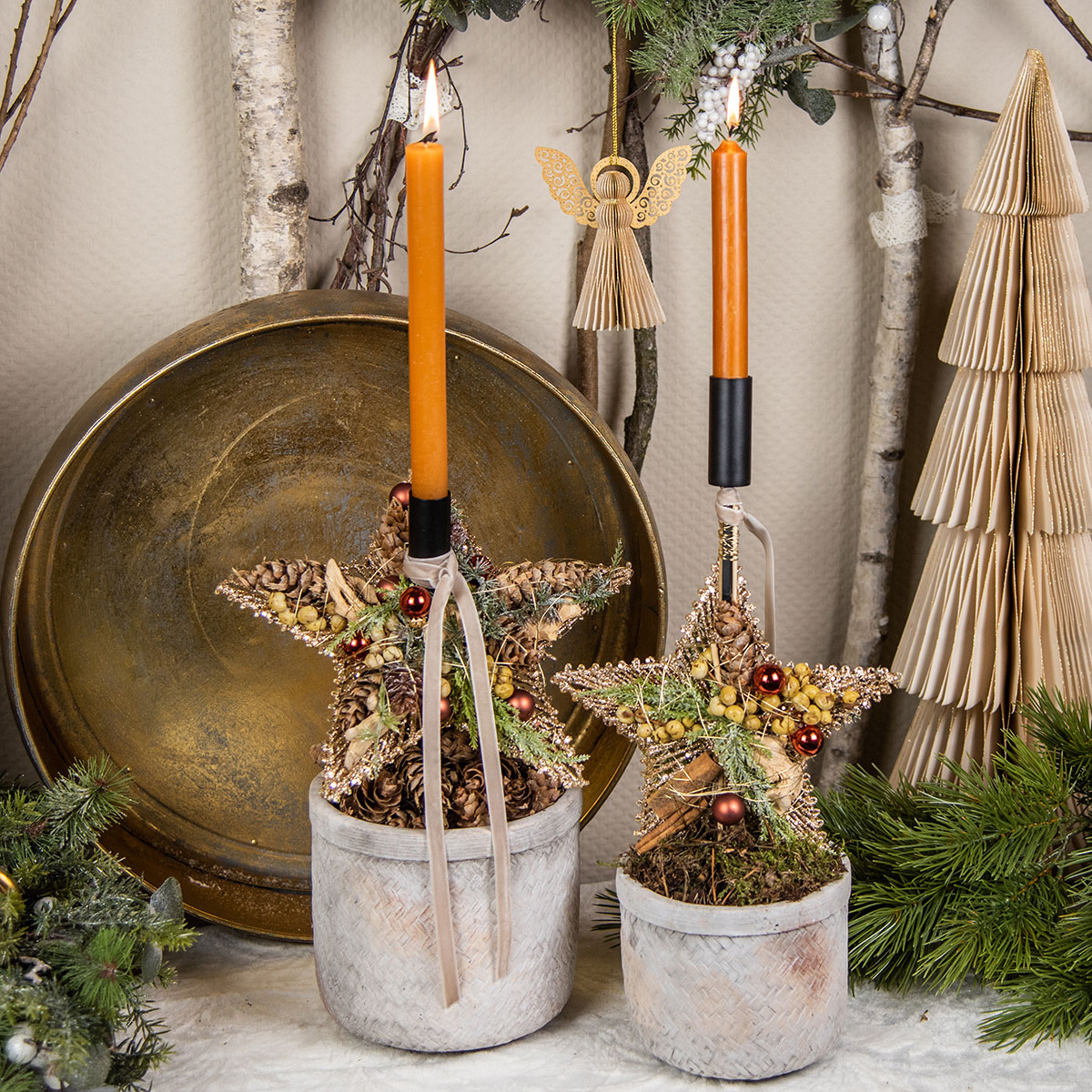 Tyto kuželové svíčky jsou ideální pro rozjímavé adventní období. Báječně se hodí ke speciálnímu adventnímu věnci v přírodních barvách s oranžovými a béžovými doplňky. Prožijte očekávání Vánoc v hřejivé záři těchto originálních adventních svíček!