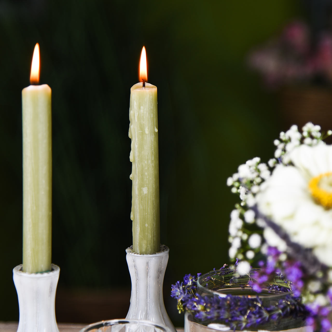 Světlá olivově zelená působí velmi přirozeným dojmem, zvláště v kombinaci s přírodními dekoracemi. Svíčky byste samozřejmě měli vždy umístit v bezpečné vzdálenosti od všech hořlavých materiálů, do bezpečného svícnu nebo do sklenice. Voskové svíčky vypadají neuvěřitelně atmosféricky s tmavým dřevem nebo žlutými květy. Ale i v kombinaci s červenou jako vánoční ozdobou dosahují dekorativní svíčky krásného barevného efektu. Tento ekologický dojem se odráží i v bezplastovém balení svíček.