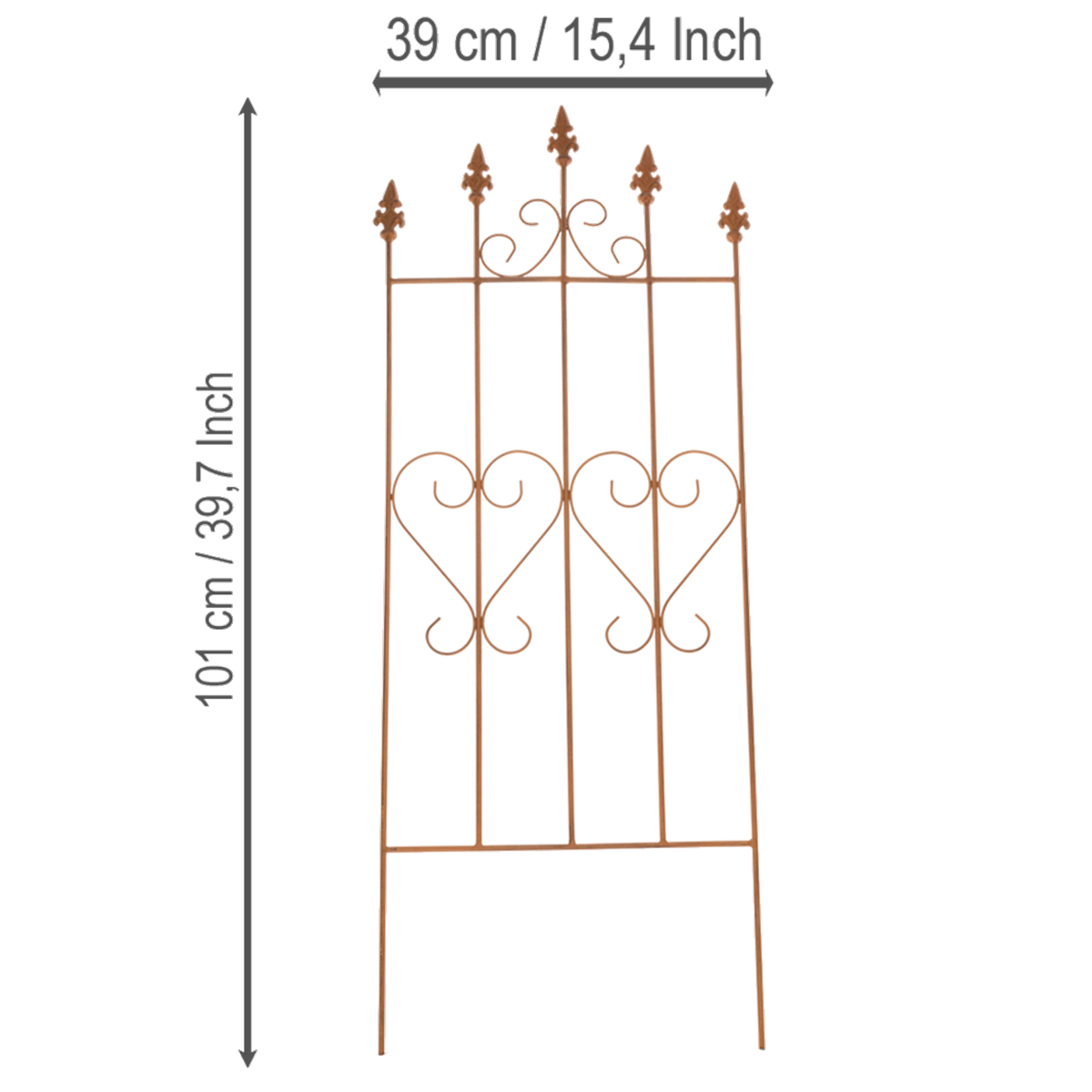 Nechte svou zahradu rozkvést! Tato treláž s nostalgickým motivem srdce nejen vyzařuje nádech romantiky, ale je také velmi praktická. Ideální pro růže nebo jako okouzlující vizuální okraj v zahradě, tato treláž dodá každému venkovnímu prostoru zvláštní nádech. S výškou 101 centimetrů, šířkou 39 centimetrů a hloubkou 1 centimetr je snadno ovladatelná a úsporná. Hnědý, opotřebovaný ocelový vzhled krásně ladí s přírodními zelenými tóny a zářivými barvami květů. Ať už na terase, v předzahrádce nebo jako dekorativní doplněk do záhonů, tato treláž je nezbytným doplňkem domácnosti pro každého milovníka přírody.