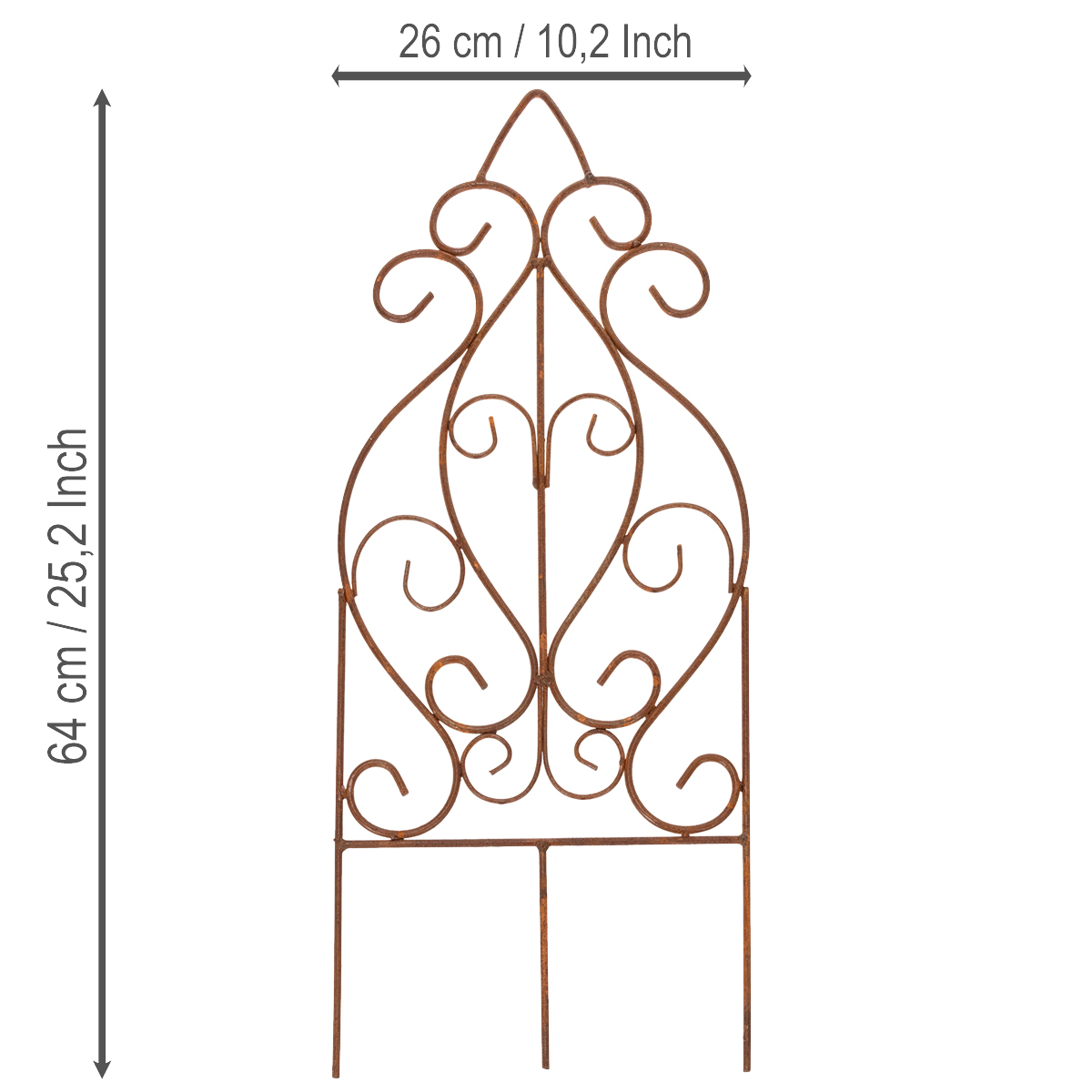 Sníte o zahradním ráji, který vás každý den znovu okouzlí? S touto kovovou treláží v sofistikované rezavé povrchové úpravě můžete během chvilky vytvořit romantický ráj a stylově vystavit své růže nebo popínavé rostliny. Ať už jako ozdoba v růžovém záhonu, decentní poutač v předzahrádce nebo elegantní opora pro vaše rostliny v záhonu – tato treláží kombinuje funkčnost s dekorativním šarmem, který zanechá trvalý dojem. Vyrobena z vysoce kvalitního kovu, je nejen robustní, ale také dodává zvláštní nádech svou teplou hnědou barvou a zaoblenými ozdobami. Díky svým rozměrům 64 cm na výšku a 26 cm na šířku se všestranně hodí do vašeho zahradního designu jako pomůcka pro popínavé rostliny a vykouzlí příjemnou atmosféru na jaře, v létě i jindy.